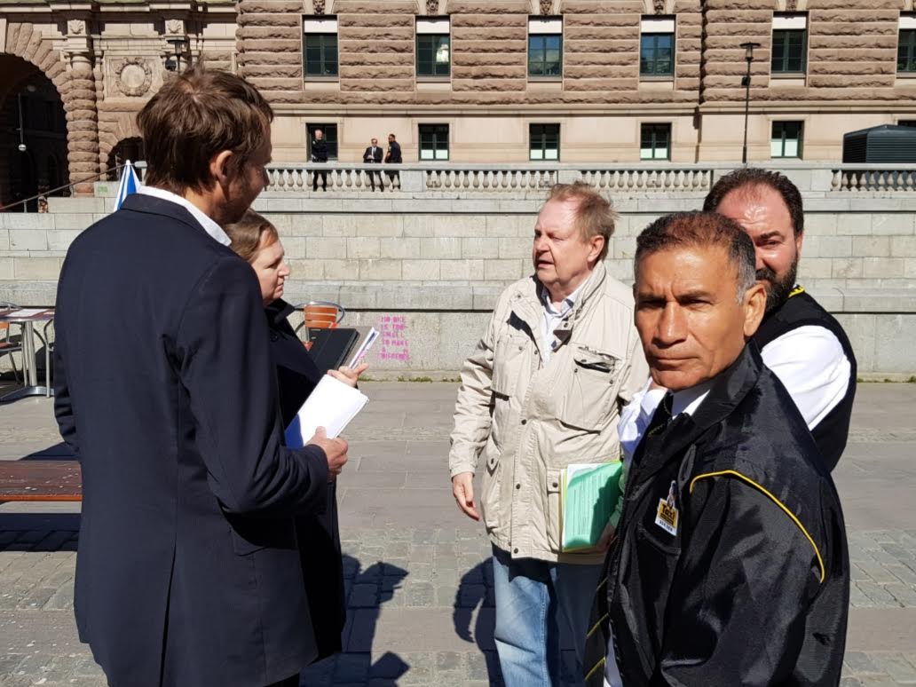 Golam Zilaei (närmast t h) och Timo Stamblewski (mitten) deltog i uppvaktningen av riksdagspolitikerna, däribland Jens Holm från Vänsterpartiet. Foto: Janne Bengtsson