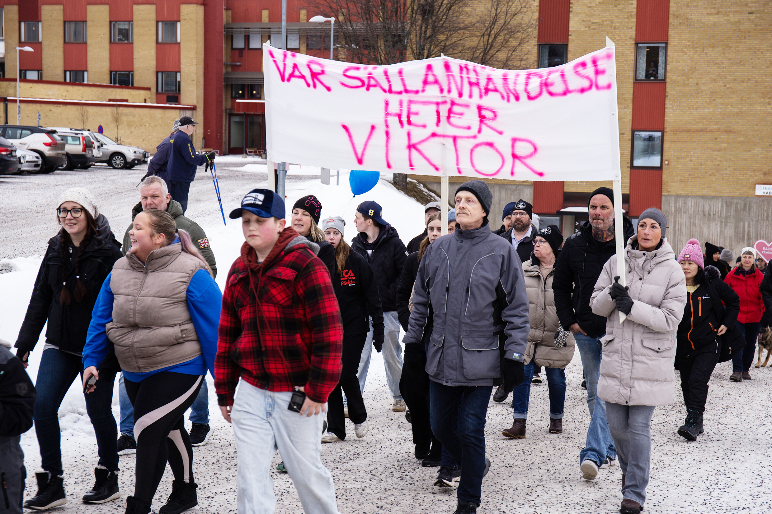 Anhöriga till Viktor Holmberg bar en egen paroll. Viktor dog 2022 18 år gammal i sprucken mjälte eftersom Sollefteå sjukhus saknade kirurg. Foto: Karin Kämsby