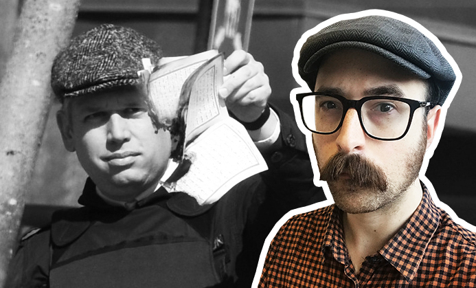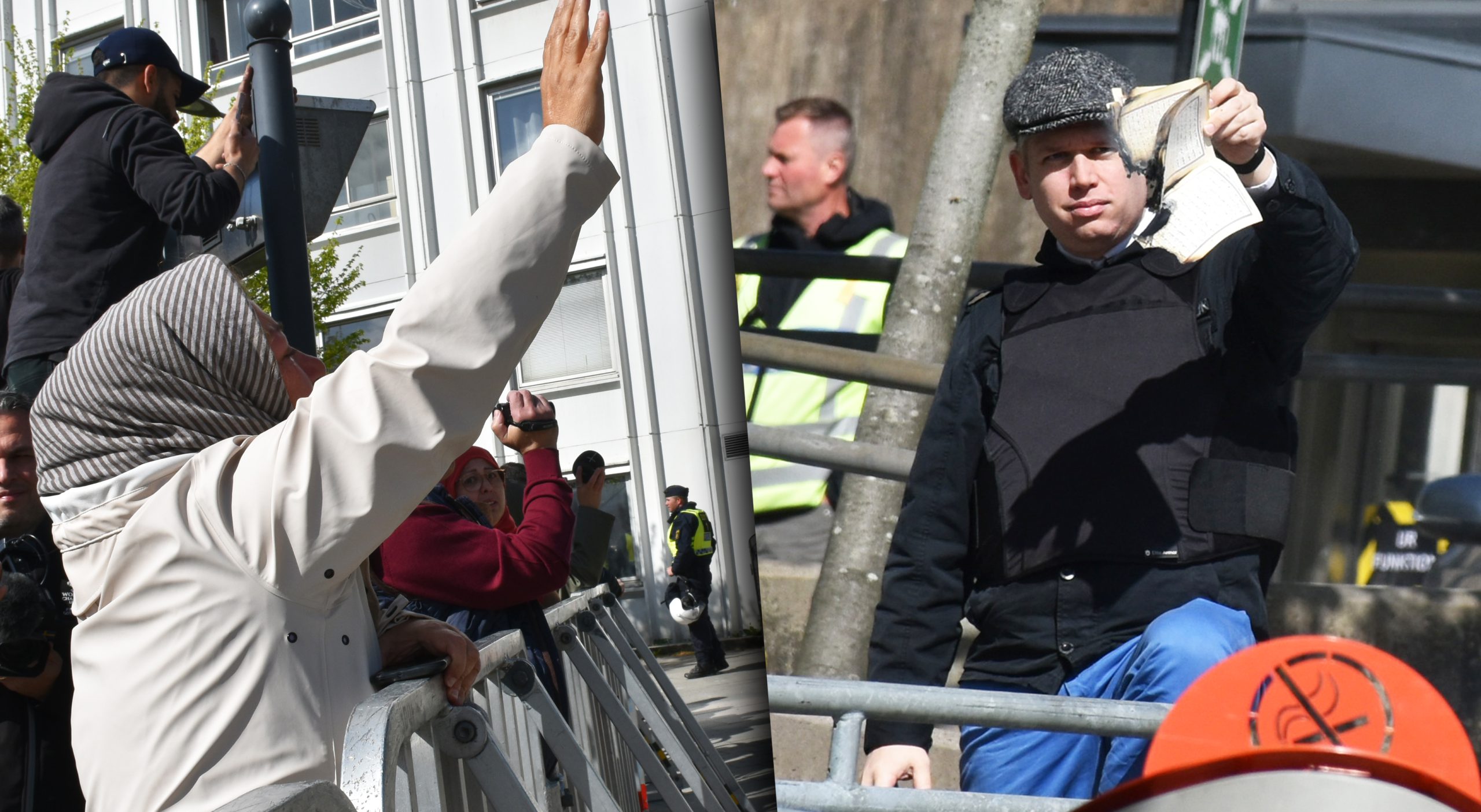 09.30. Så kommer han. Danskjäveln. Lite småtjock. Iklädd skyddsväst, gubbkeps och sitt bredaste Kim Larsen-leende. Han har ett litet följe med sig. En biffig huligan, några skuggiga typer, och en liten lärjunge i vad som ser ut att vara de yngre tonåren som fått i uppdrag att filma spektaklet. Tanken slår mig: Paludan gillar ju småpojkar. Fan… ska man göra en orosanmälan?