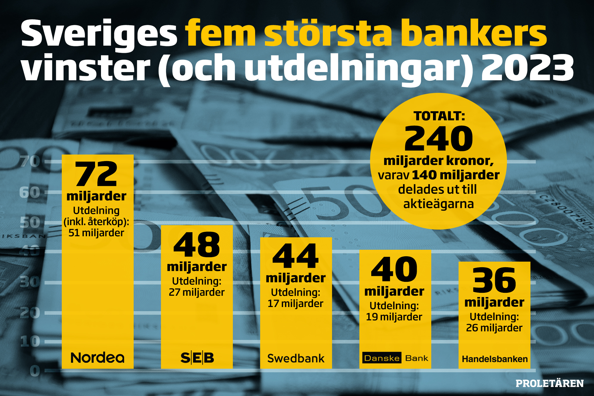 Sveriges fem största banker – SEB, Swedbank, Handelsbanken, Nordea och Danske bank, de två sistnämnda med huvudkontor i Helsingfors respektive Köpenhamn, slår rekord i både vinst och utdelningar. Totalt blir det 140 miljarder kronor för de aktieägarna att dela på, detta står klart efter att samtliga banker publicerat sina sista kvartalsrapporter för 2023.