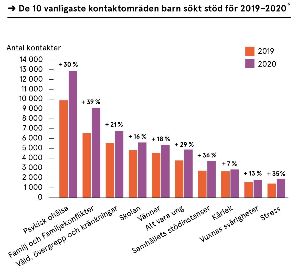 Under 2020 har Bris totalt tagit emot 31.794 samtal. En ökning med 16 procent från föregående år och det högsta antalet samtal någonsin. Samtalen som bidrog mest till ökningen var de som handlade om psykisk ohälsa och familjekonflikter.