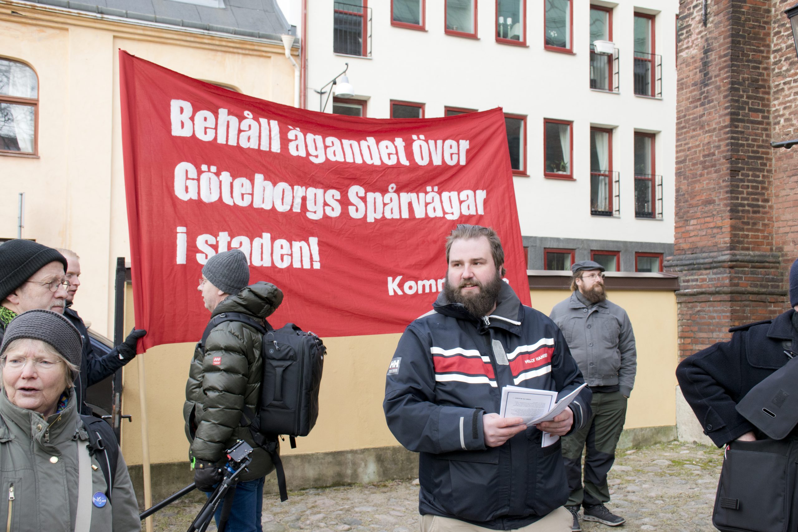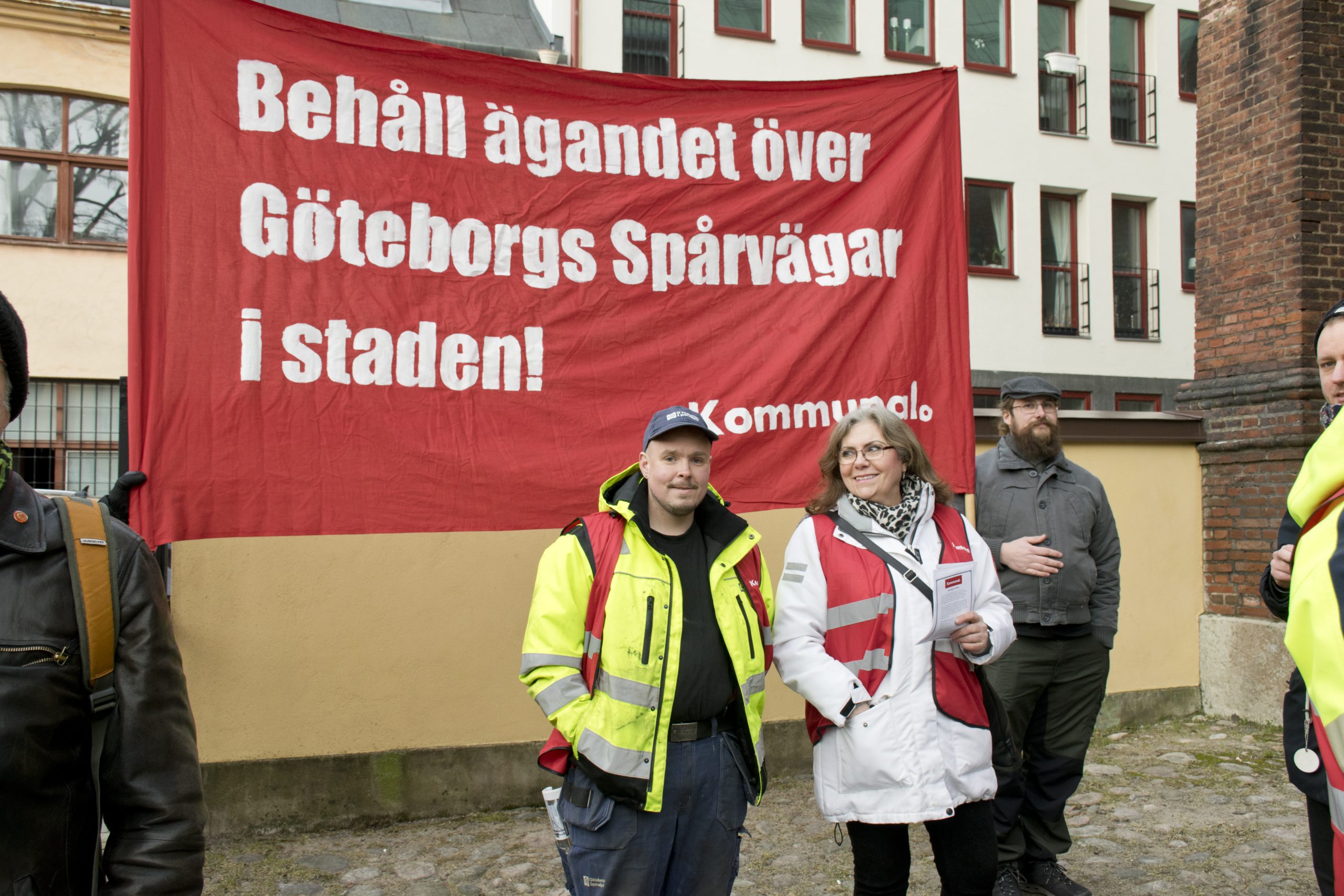 Det var fler protesterande än vanligt när kommunpolitikerna samlades till möte i Göteborg. Förutom aktivister för flyktingamnesti och mot Västlänken möttes politikerna av ett tydligt budskap från en stor samling spårvägsanställda: “Behåll ägandet över Göteborgs spårvägar i staden”.