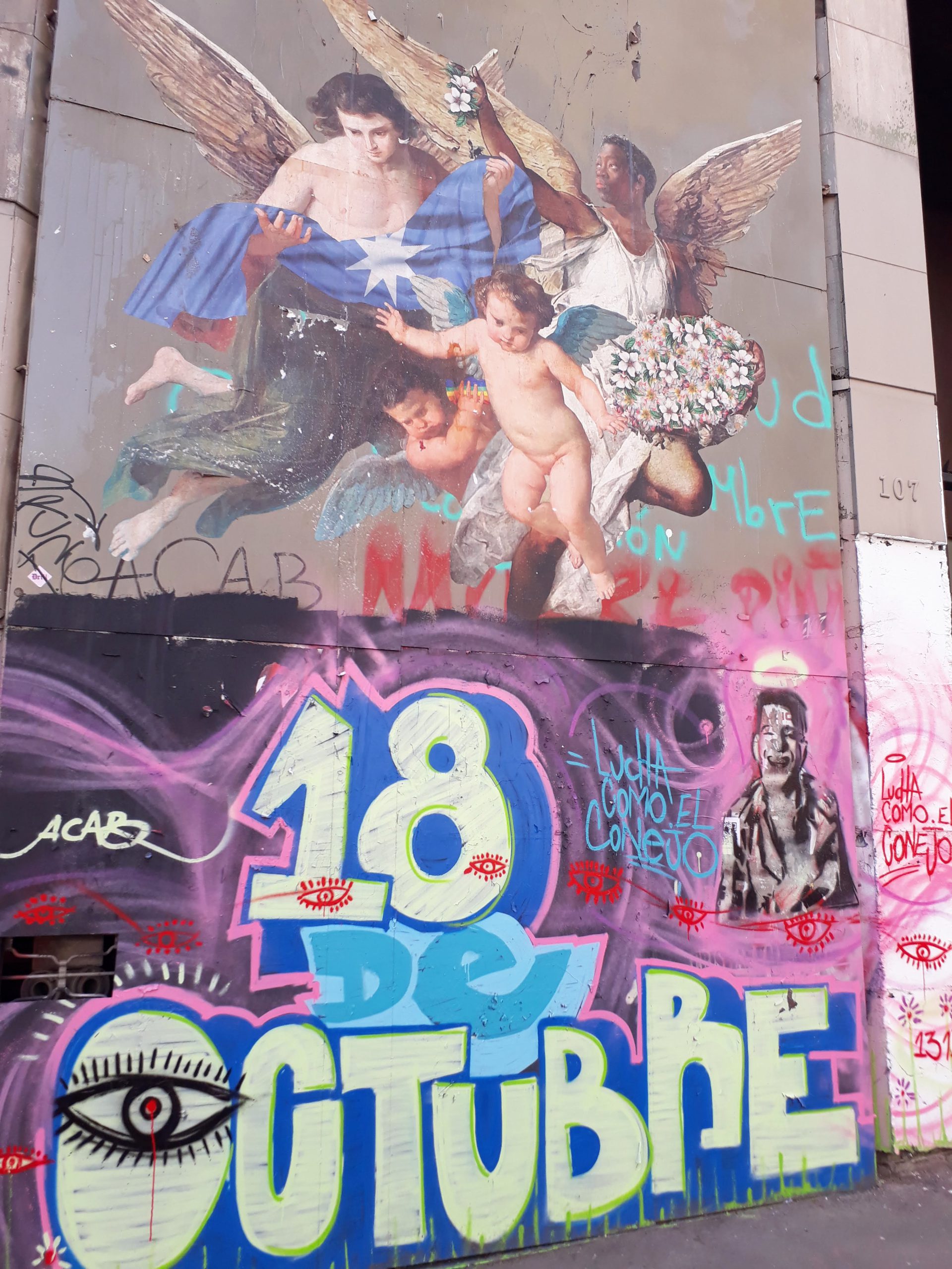 Det första jag gjorde var att delta på en demonstration på Plaza de la Dignidad (värdighetens torg, tidigare plaza Italia) till stöd för oktoberrevoltens politiska fångar. På vägen dit kunde jag läsa skrivna protestord på väggar och murar längs huvudgatan la Alameda, i närheten av kulturcentret GAM och kring torget.