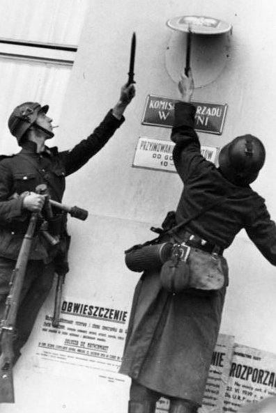 På bilden syns två tyskar plocka ner den polska örnen från en myndighetsbyggnad i hamnstaden Gdynia, norra Polen. Örnen ersattes med hakkorset och återstoden av Polen blev ”Generalguvernementet”.