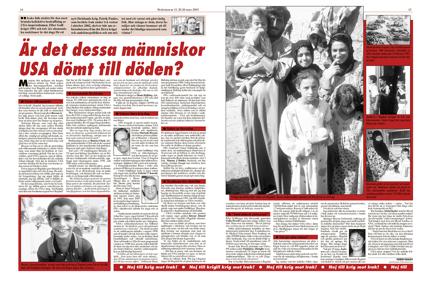– Man kan säga att upptakten till kriget hade pågått sedan gulfkriget 1990-1991. Det blev aldrig fred efter det, säger Patrik Paulov, nybliven utrikesredaktör för Proletären när kriget bröt ut 2003.