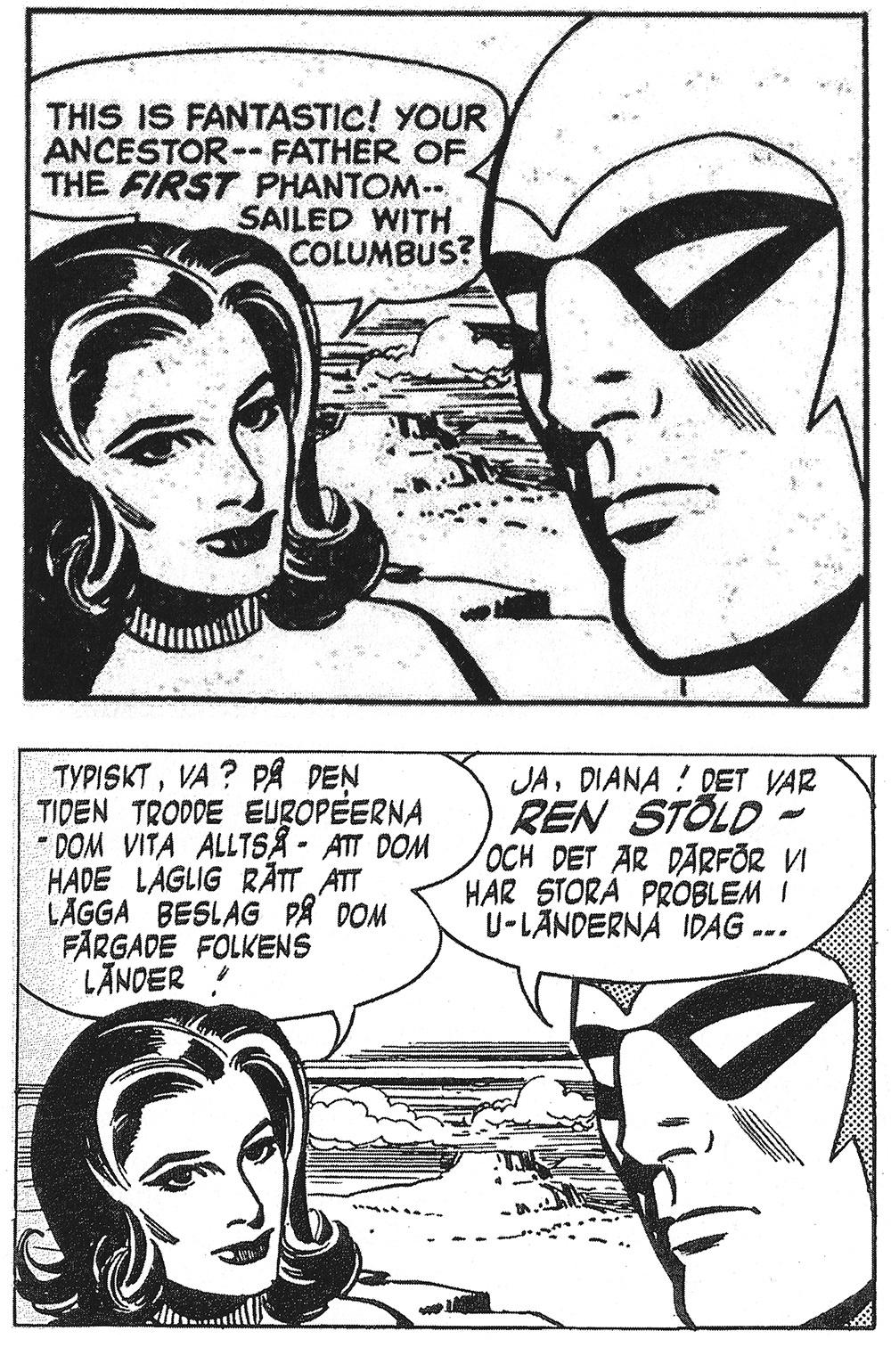 I den svenska versionen av samma serieruta säger Diana ”Typiskt va? På de tiden trodde européerna – dom vita alltså – att dom hade laglig rätt att lägga beslag på dom färgade folkens länder”.