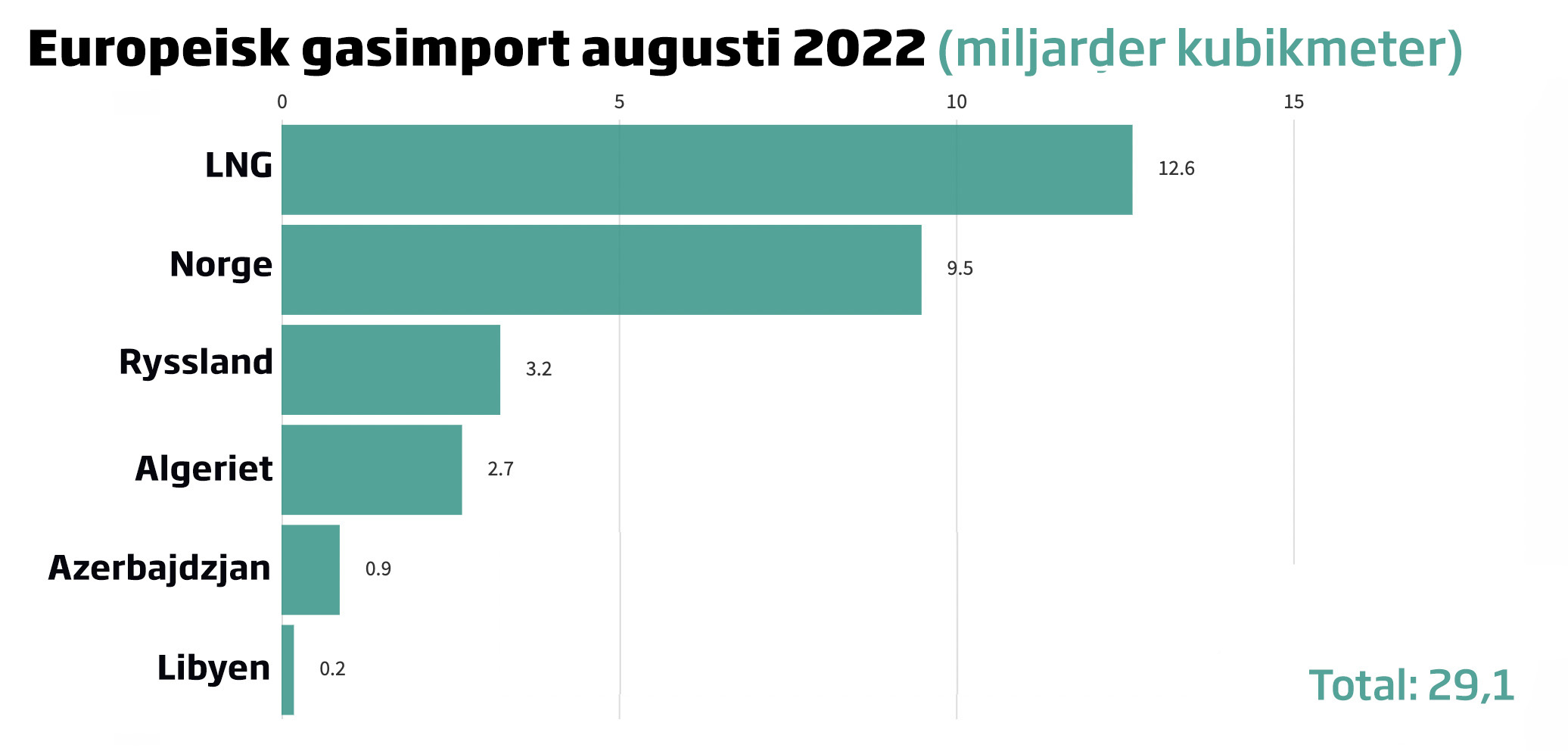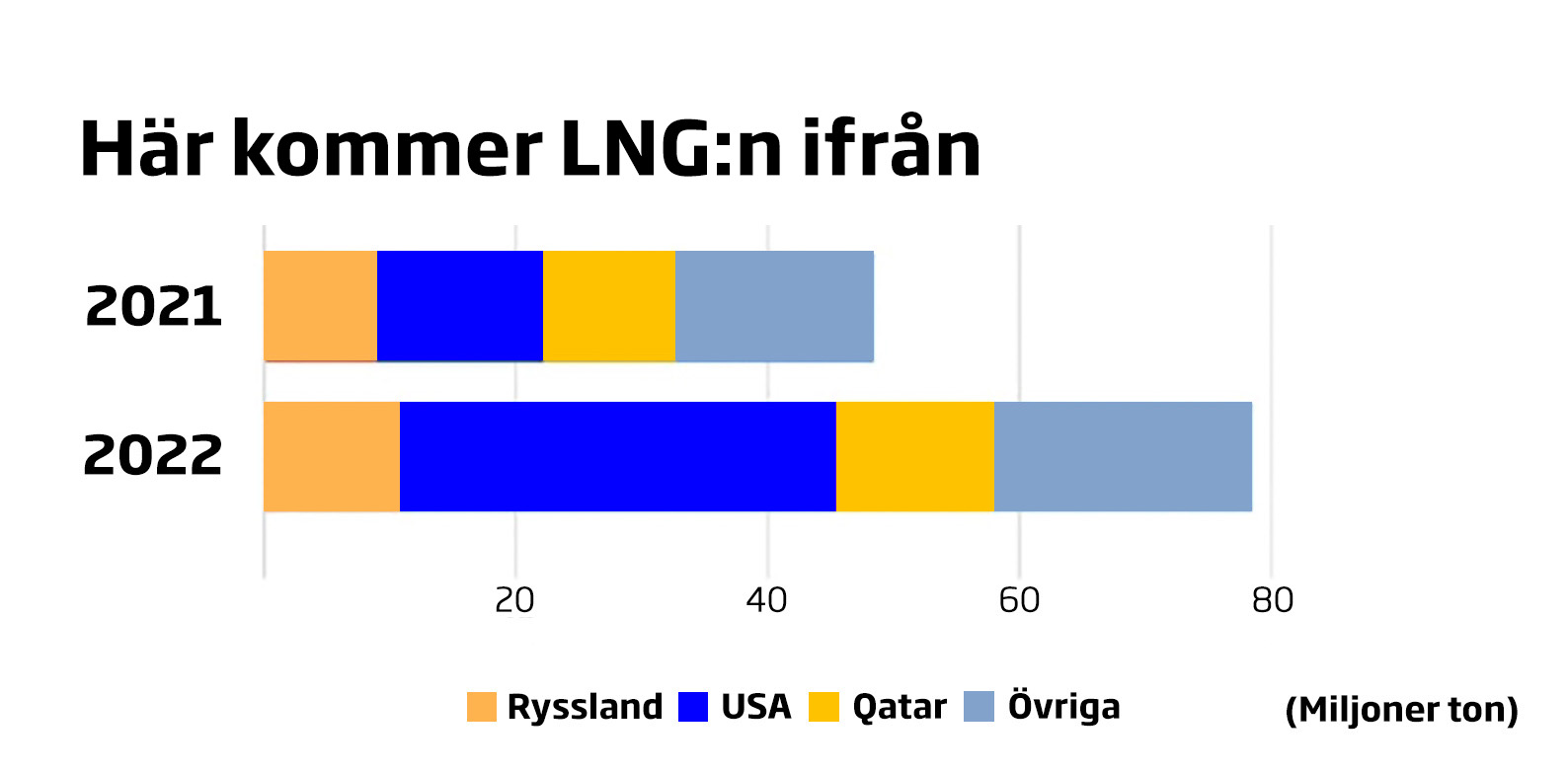 Frånvaron av gas från öst har öppnat ett hål i marknaden som delvis täppts igen med ett relativt nytt fenomen på energimarknaden – flytande naturgas (Liquified Natural Gas, LNG) – som ersatt rysk gas som Europas främsta naturgaskälla.