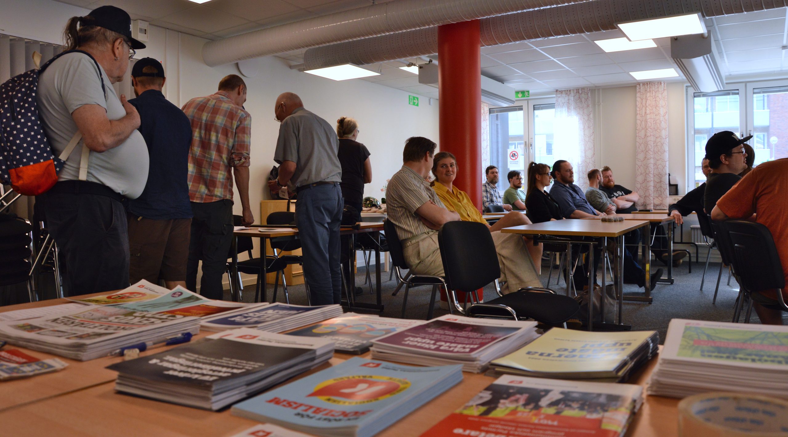 Den som håller i mötet är Joakim Karlsson, tågvärd, styrelseledamot i Seko Klubb 114 och medlem i Kommunistiska Partiet.