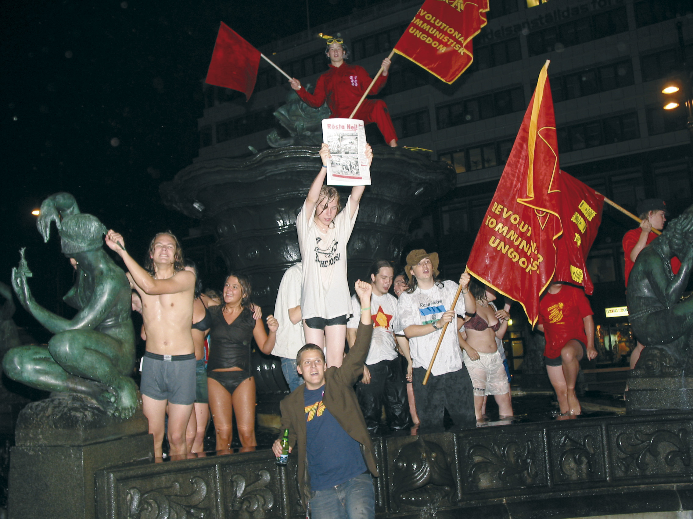 Fontänbad på Järntorget efter EMU-segern 2003. Foto: Arkivbild / Proletären