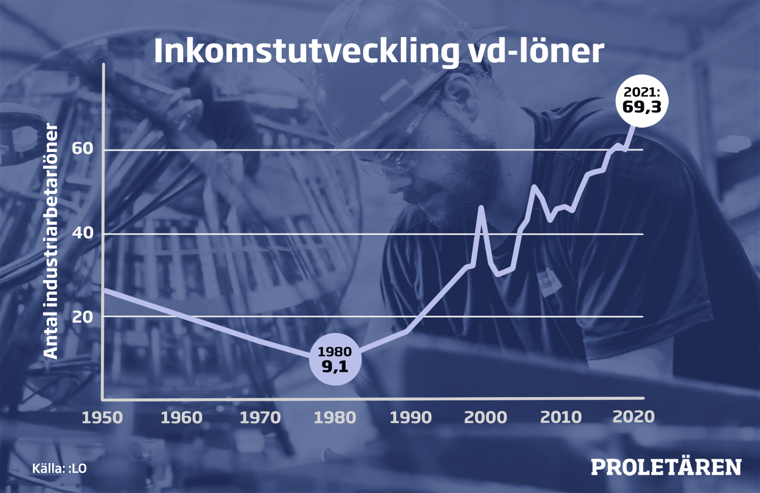 En genomsnittlig topp-vd tjänar nu 69,3 genomsnittliga industriarbetarlöner. Det är den största skillnaden som uppmätts sedan undersökningen startades 1950.