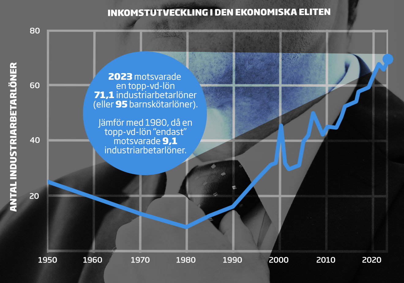 Den genomsnittliga inkomsten för vd:arna på 50 av de största svenska företagen motsvarar nu hela 71,1 industriarbetarlöner. En ökning med fyra industriarbetarlöner på bara något år och mer än en fördubbling jämfört med åren efter millennieskiftet (då den motsvarade omkring 30 industriarbetarlöner).