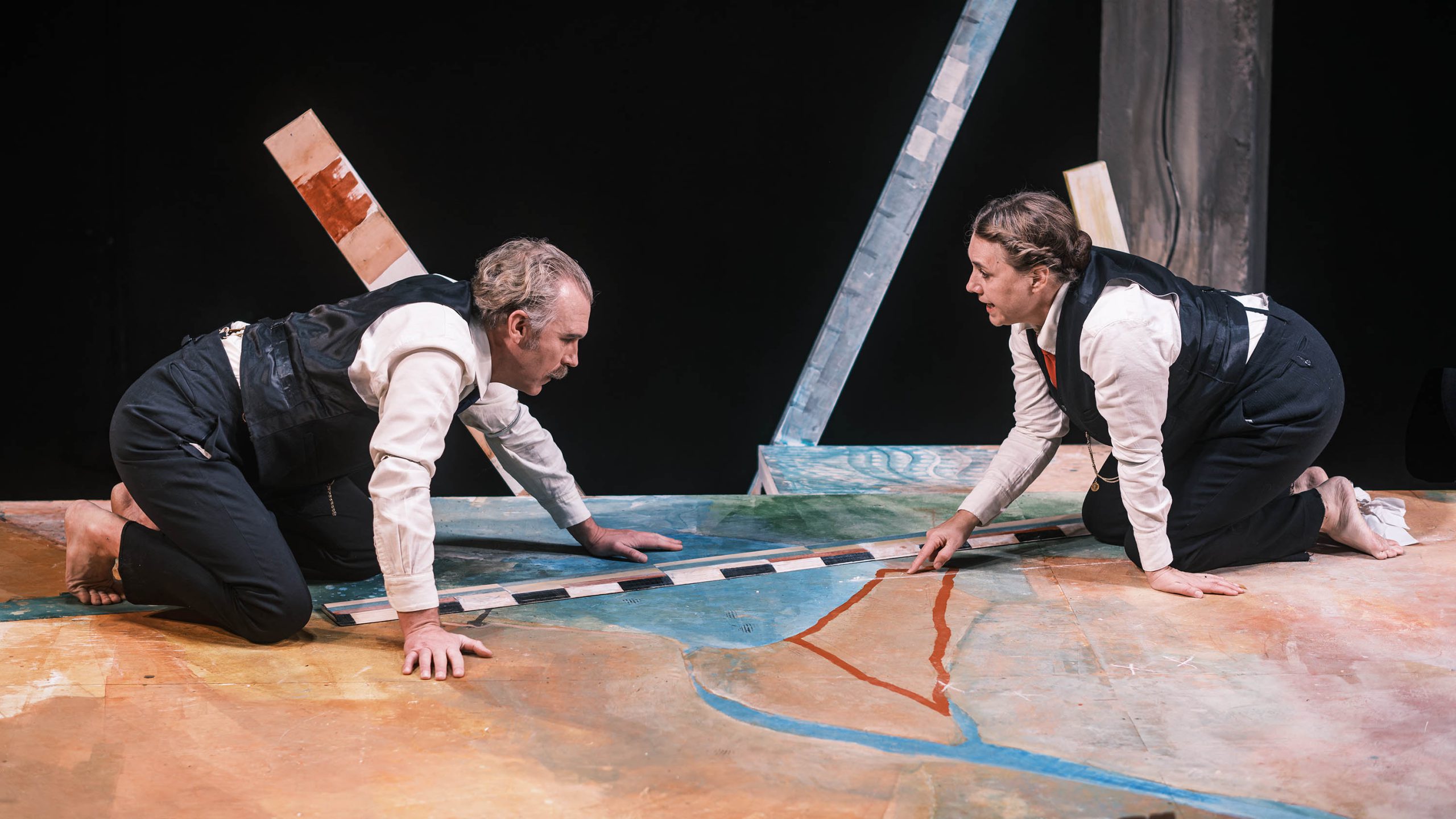 Jan Ärfström och Anna Maria Käll gestaltar två statstjänstemän som ska dela upp Palestina efter imperialisternas önskemål. Foto: Henrik Dahl/Pressbild