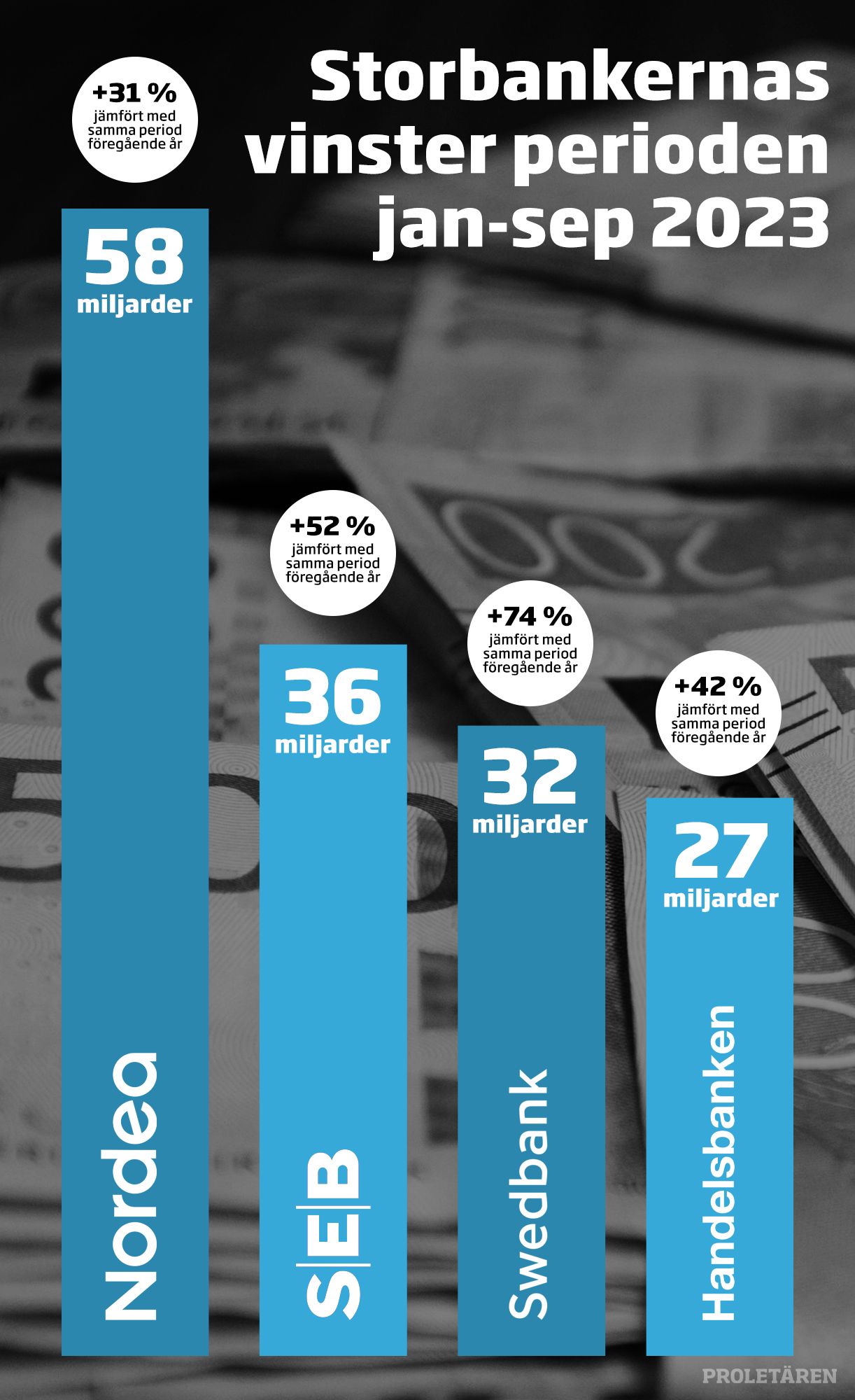 Mellan juli och september 2023 gjorde Sveriges fyra största banker sammanlagt 56 miljarder kronor i vinst. Som jämförelse beräknar Sveriges kommuner och regioner (SKR) att välfärden går med 28 miljarder kronor i underskott nästa år och vissa kommuner har redan infört vikariestopp på grund av det tuffa ekonomiska läget, något som Proletären skrev om i förra veckan.