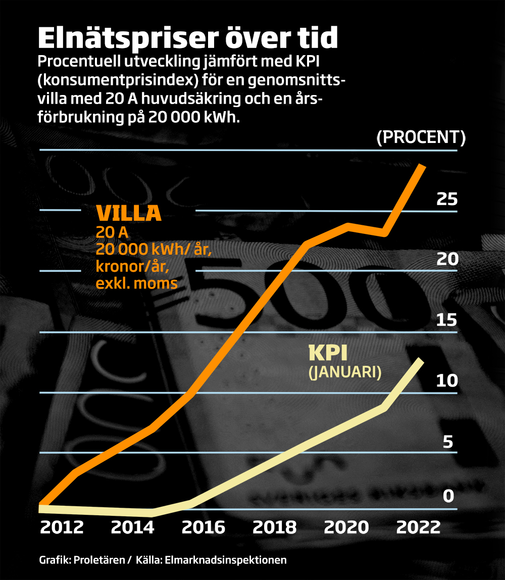 Enligt Dagens Nyheters granskning så har elnätspriset ökat med 28 procent under de senaste tio åren – mer än dubbelt så mycket som inflationen under samma period. Sveriges näst största elnätsföretag, Ellevio, höjde elnätspriset för lägenhetsinnehavare i Stockholm med 67 procent.