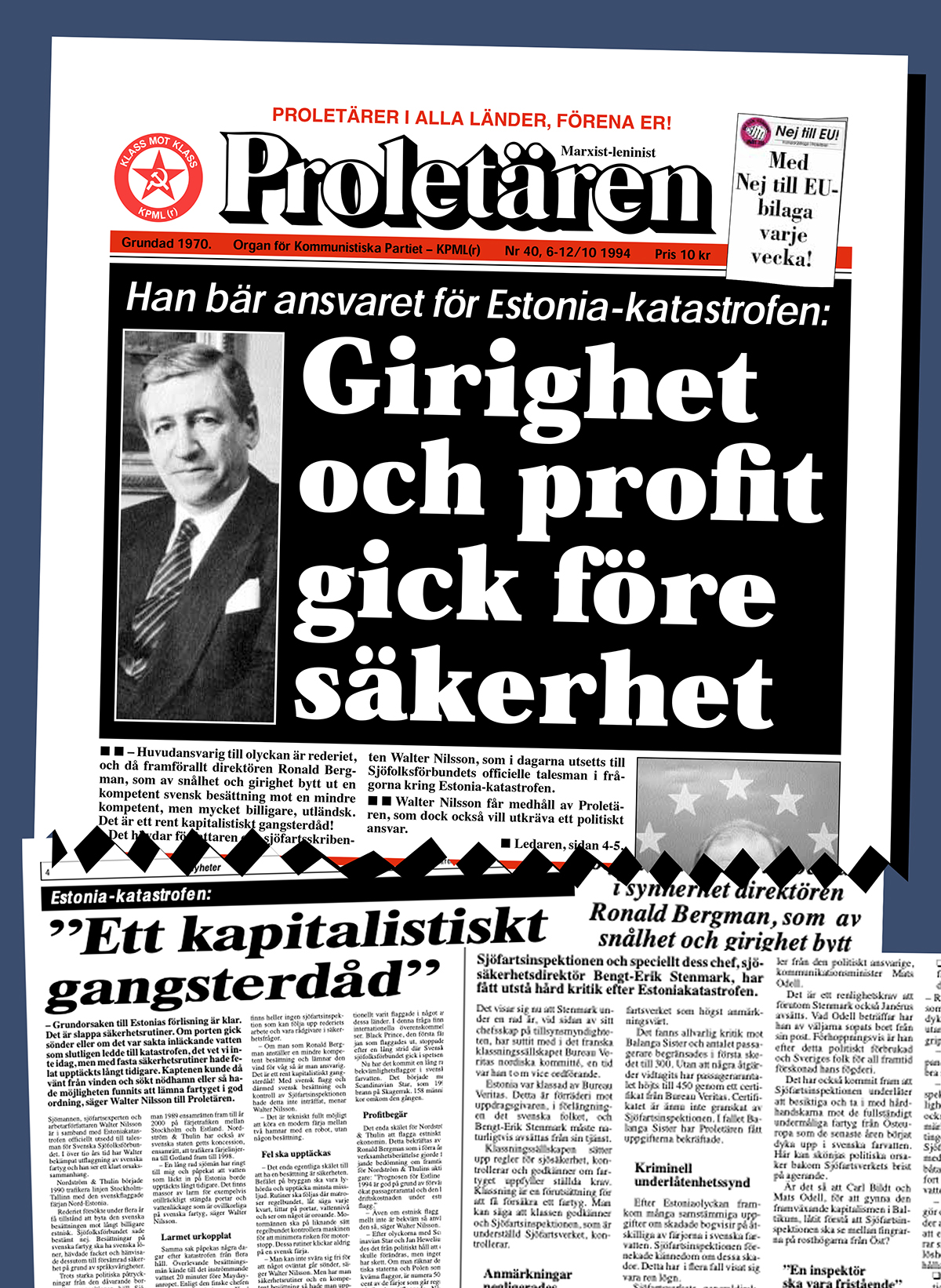 Proletären pekade redan veckan efter olyckan ut Ronald Bergman, vd på Estonias rederi Nordström & Thulin, som huvudansvarig för olyckan. Vi anklagade Bergman för att han av girighet flaggat ut Estonia till Estland och bytt ut en kompetent svensk besättning mot en billigare utländsk.