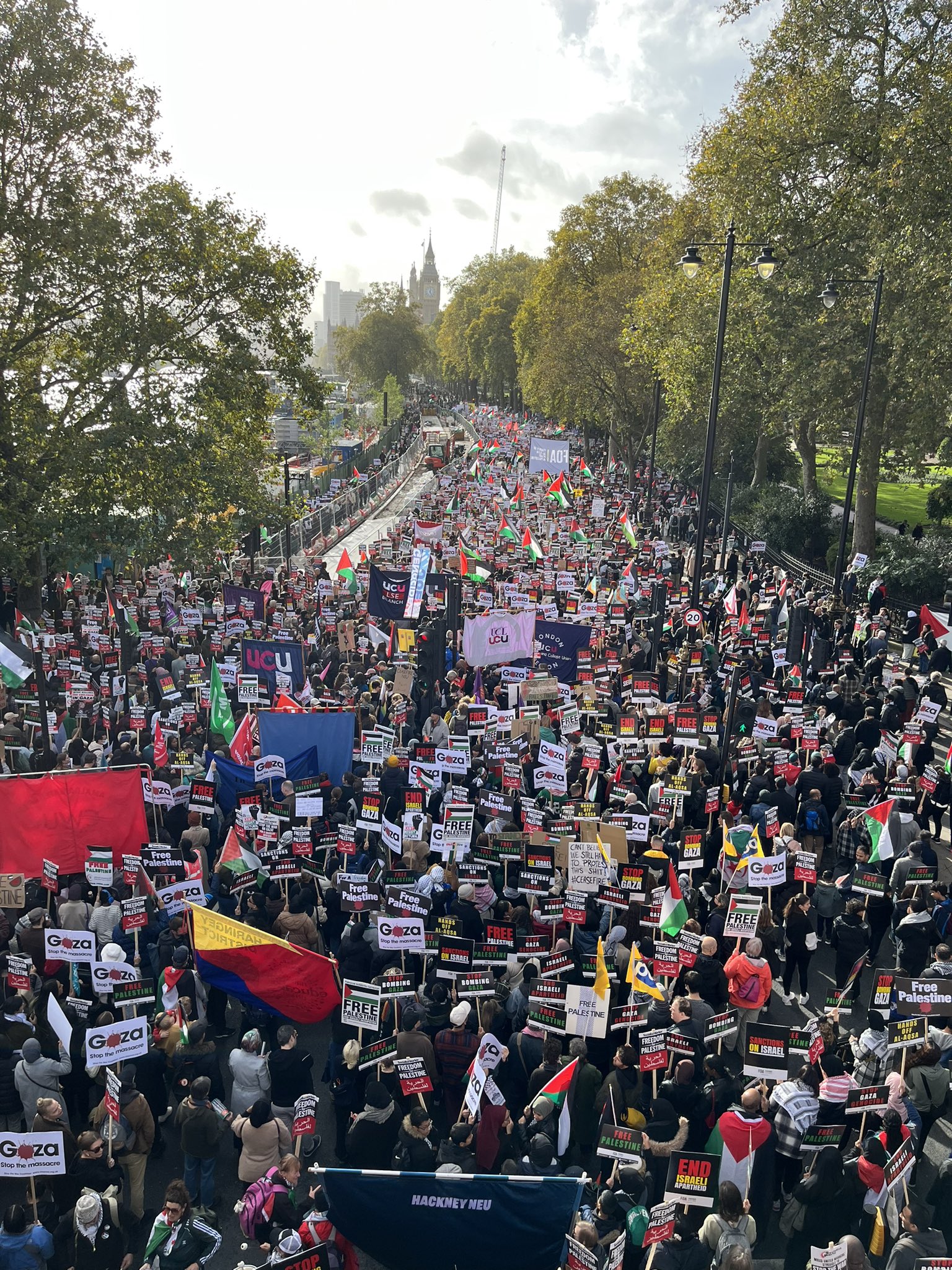 De exakta siffrorna varierar men flera hundra tusen demonstrerade för Palestina i London i lördags. Enligt Morning Star var det så många som en halv miljon människor som gått ut på gatan i solidaritet med Gaza och i protest mot Israels pågående folkmord på palestinierna.