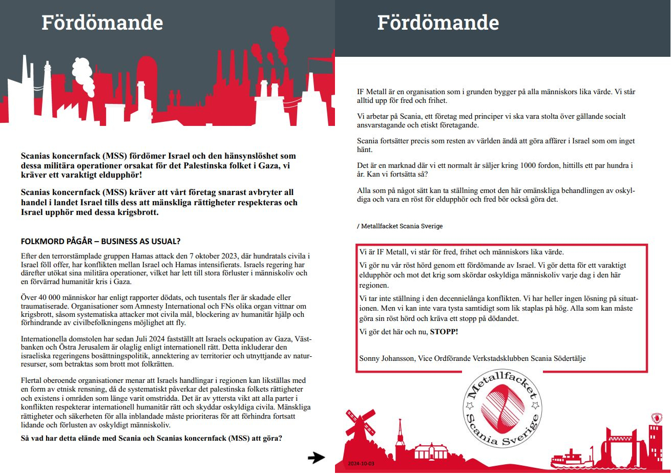 IF Metalls verkstadsklubb på Scania i Södertälje har antagit ett uttalande som fördömer Israel och landets krig mot Gaza. Nu kräver klubben, som har runt 4.800 medlemmar, en varaktig vapenvila och att Scania stryper sina affärer i Israel.