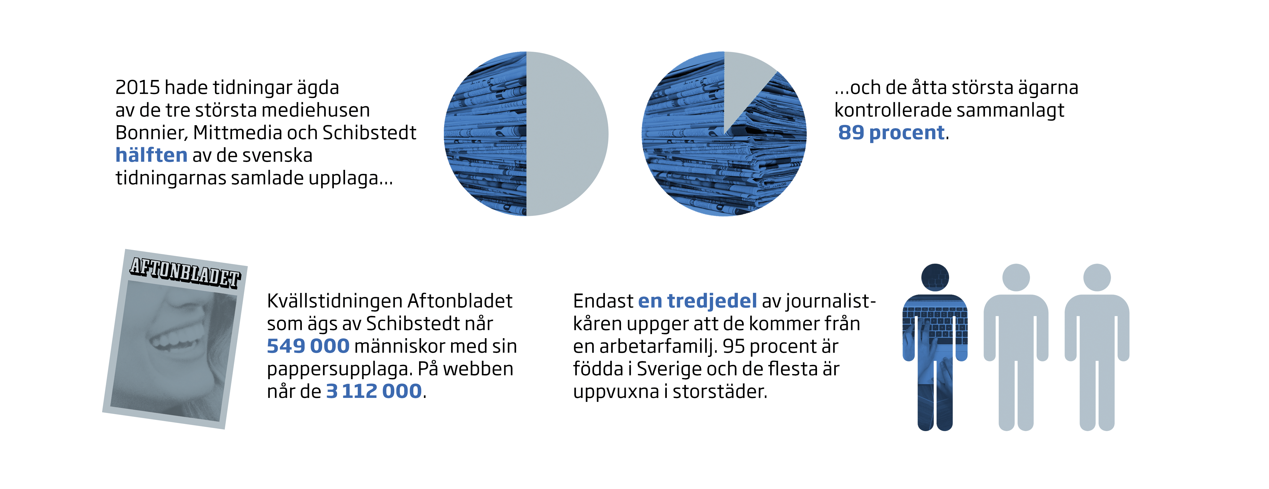 Tidningsbranschen blir dessutom allt mer monopoliserad. År 2015 hade tidningar ägda av de tre största tidningskoncernerna, Bonnier, Mittmedia och Schibstedt, ungefär hälften av den samlade upplagan. De åtta största ägarna kontrollerar 89 procent av upplagan.