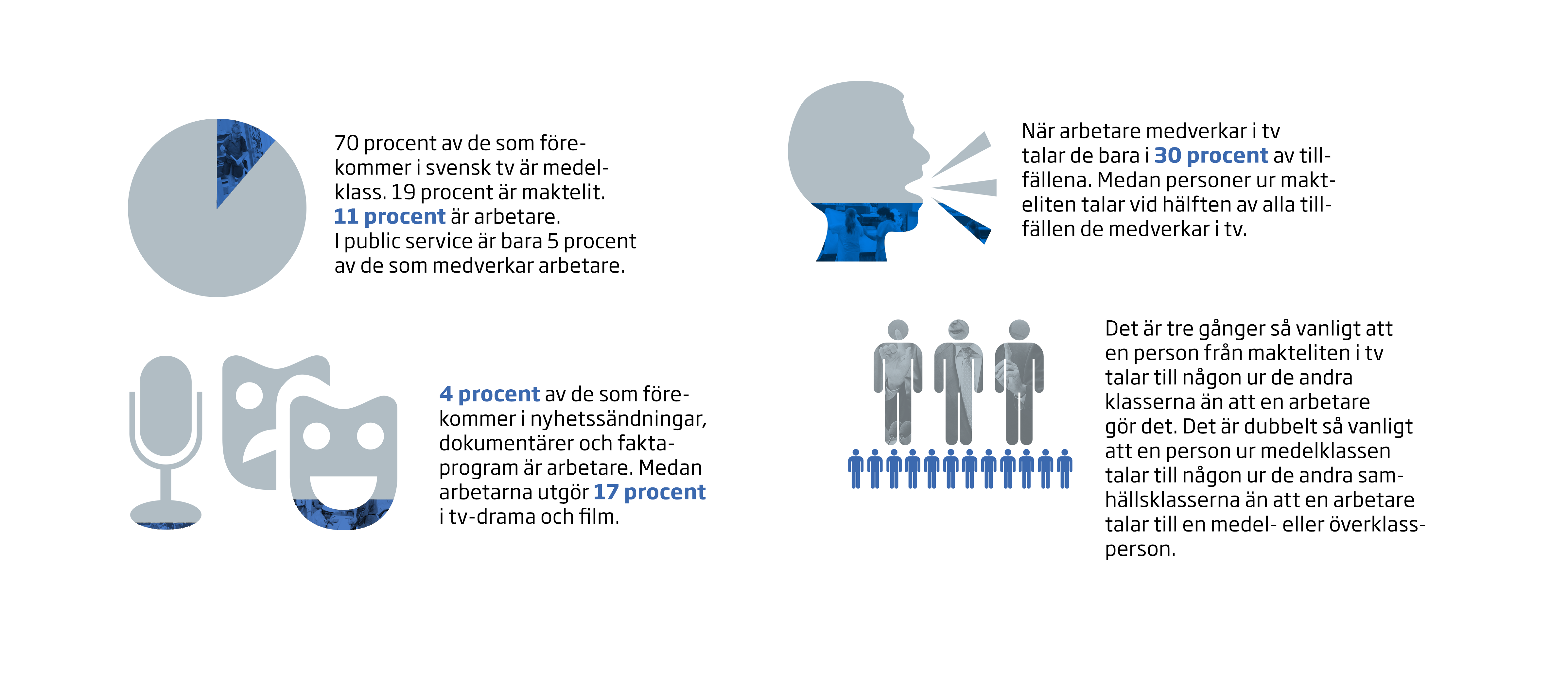 När arbetare väl förekommer på tv är de ofta bifigurer eller placeras i historisk tid. I nyhetsprogram, dokumentärer och faktaprogram är bara 4 procent av de som medverkar arbetare. Och andelen har minskat. Både för att styrkeförhållandena mellan arbete och kapital har försämrats och för att medierna har kommersialiserats och fyllts av experter och proffstyckare. Det är också väldigt vanligt att journalister intervjuar journalister. När samhällsfrågorna ska diskuteras ställs alltså halva befolkningen, arbetarklassen, utanför.