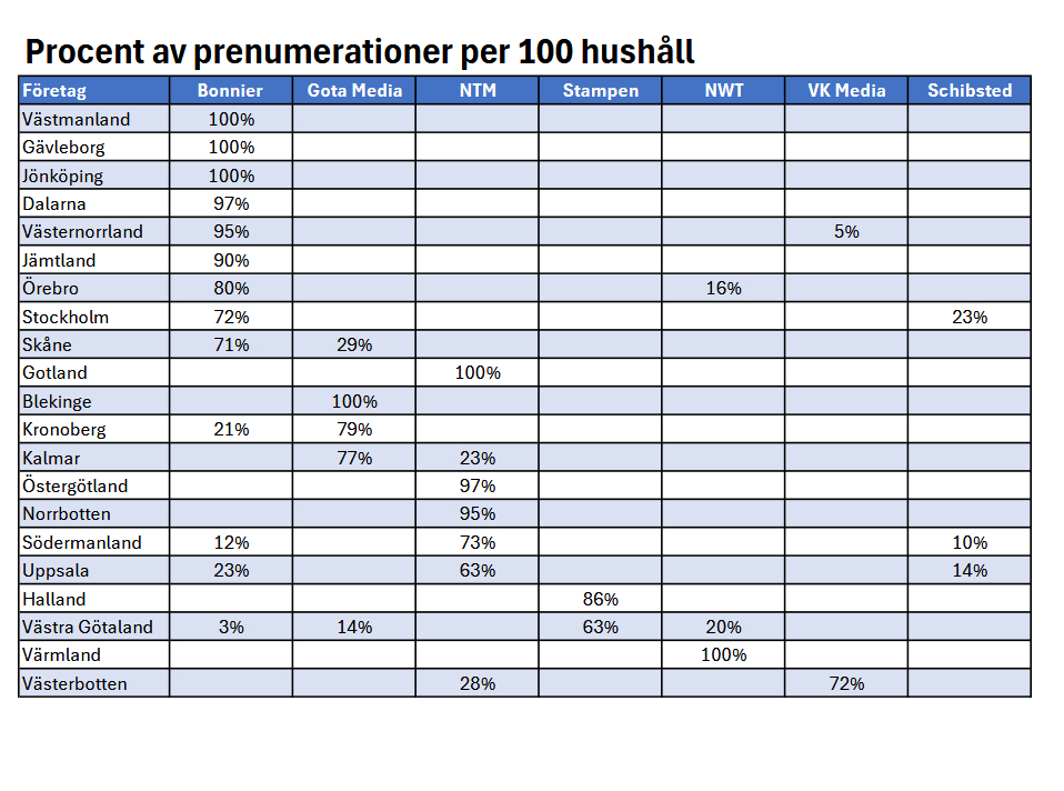 Schibsted/Stampen/NWT/VK-Media har i sin tur monopol i Halland och Värmland. Lägger man till länen där denna ägarsfär kontrollerar mer än 80 procent av alla prenumerationer går det också lägga till Västra Götaland och Västerbottens län.