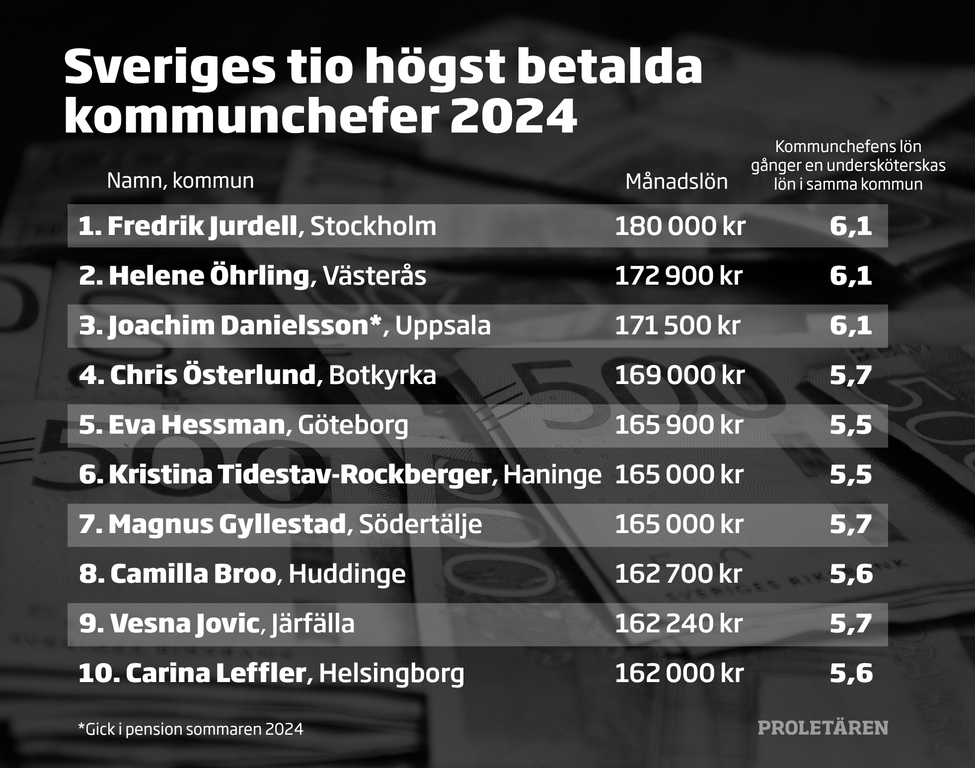 De tio högst betalda kommuncheferna i Sverige år 2024. Källa: Aftonbladet och Kommunalarbetaren Foto: Proletären
