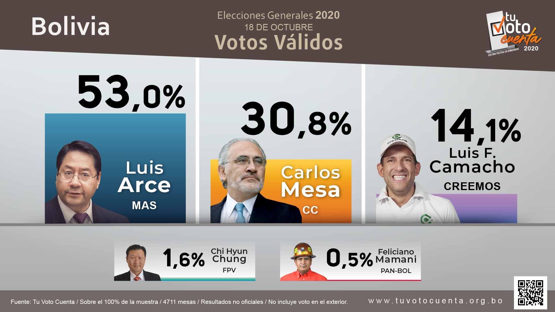 Mas kandidat Luis Arce blir president redan efter första valomgången, visar vallokalsundersökningarna. Med 53 procent av rösterna, över 20 procentenheter mer än högerkandidaten Carlos Mesa, ser det socialistiska Maspartiet också ut att få egen majoritet i både övre och undre kammaren i parlamentet.