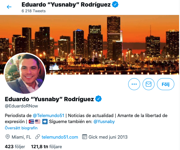 I sitt grävjobb går Julián Macías Tovar inte vidare med vem användaren ”Yusnaby” är. Men Proletären har granskat kontot, som alltså var den förste att rapportera från protesterna. Mannen bakom kontot är Eduardo Rodriguez, en exilkubansk journalist på nyhetskanalen Telemundo51 i Miami, USA, där han bott åtminstone de senaste sex åren.