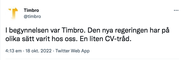 Detta skryter Timbro själva med på Twitter. I en ”CV-tråd” lyfter de fram några av de nya ministrarnas Timbrokopplingar.