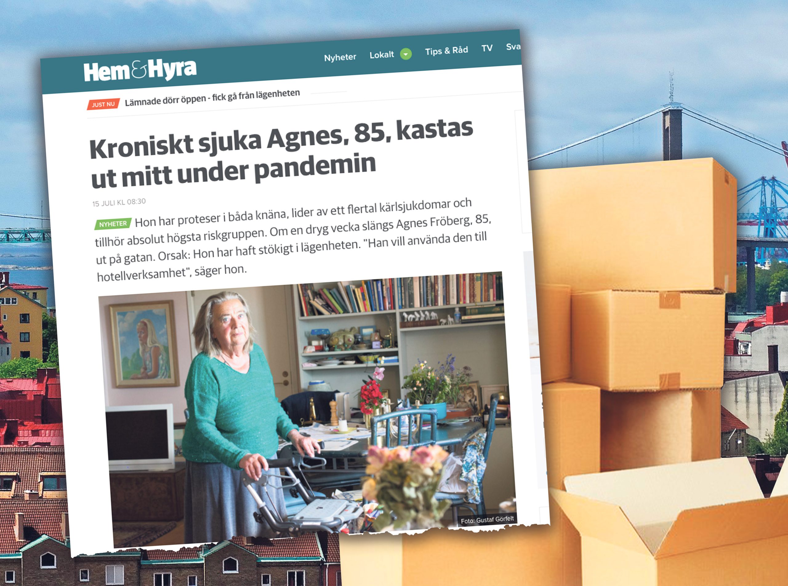 Agnes Fröberg, 85, tillhör den yttersta riskgruppen vad gäller coronaviruset. Hon har kronisk inflammation i lederna, diagnosticerat magbråck, proteser i båda knäna och är i behov av rollator. Från och med den 23 juli är hon dessutom hemlös.