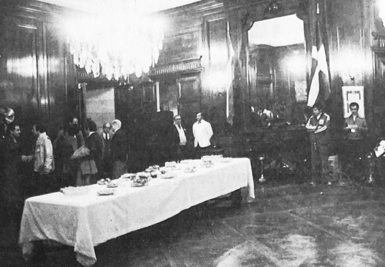 I drygt en halvtimme fick vi vänta innan general Merlo var klar med den svenska delegationen och sina taskspelarkonster. Jag såg mig omkring i rummet. Det var ganska stort och högt i tak. Framför mig hängde en jättestor spegel med den svenska och den argentinska flaggan prydligt på varsin sida. I spegeln kunde jag se de stora gnistrande kristallkronorna i taket liksom det väldukade bordet mitt på golvet.