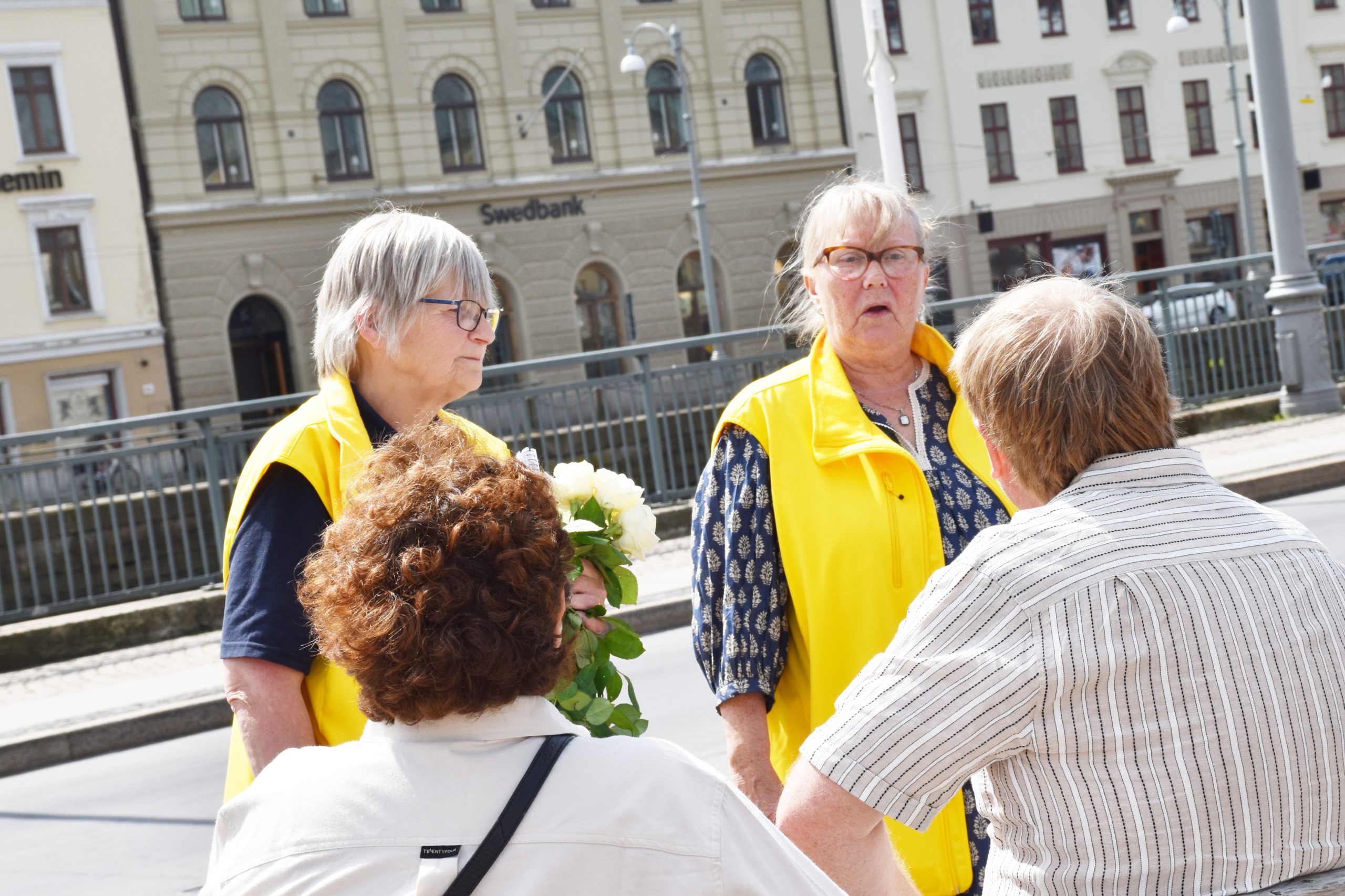 På torget träffar vi nattvandrarna Marita Karlsson och Yvonne Sana, som delar ut blommor till förbipasserande. De berättar att bemötandet är bra, och att många vill prata om våldet och skjutningarna.