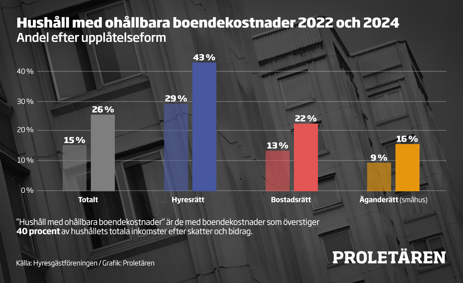 För två år sedan, 2022, var det 29 procent av alla hyreshushåll som betalade mer än 40 procent av sin inkomst i boendekostnader. Idag är siffran uppe i hela 43 procent.