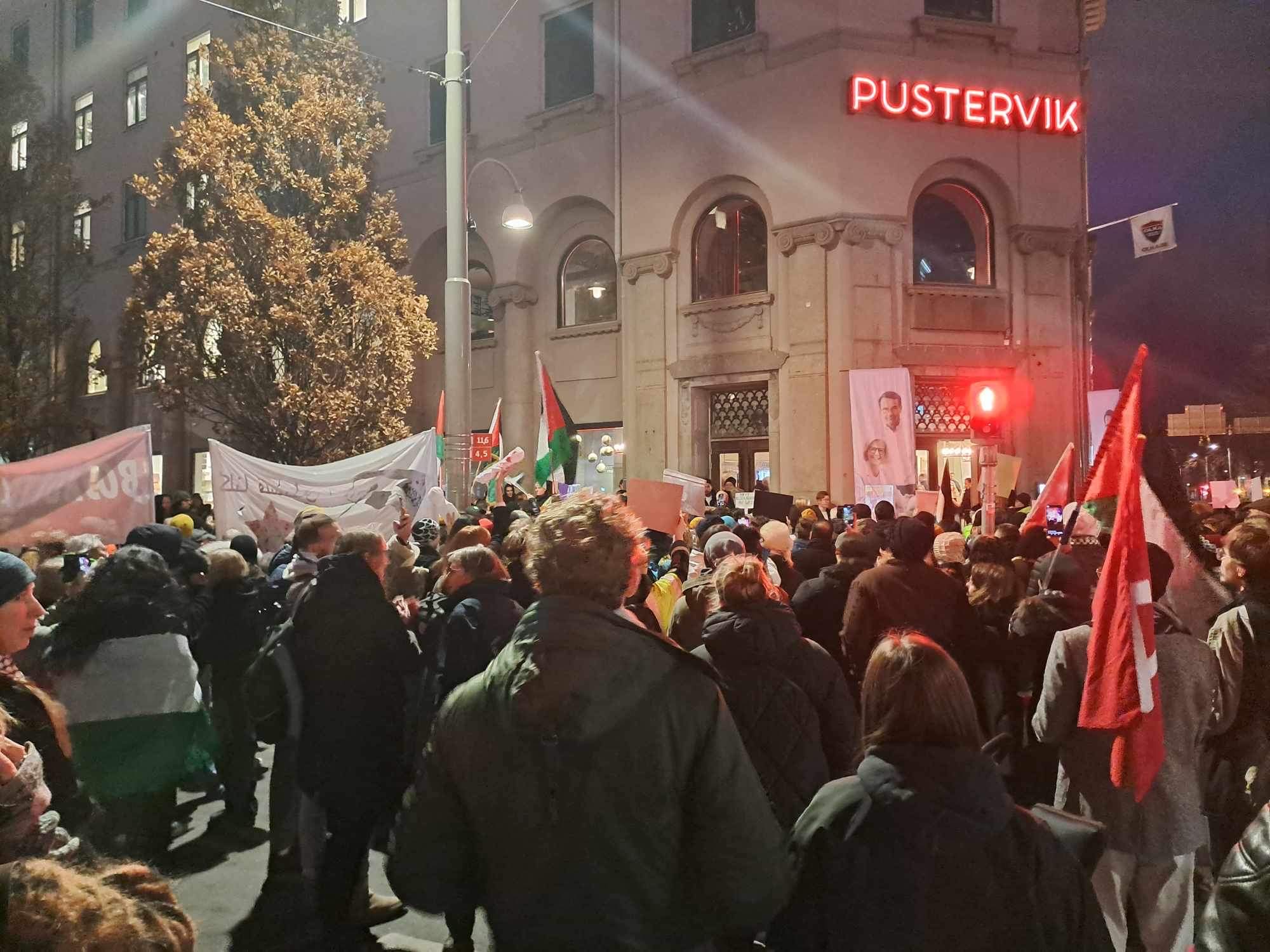 Redan en timme före mötet hade en stor folkmassa samlats utanför lokalen för att visa sitt missnöje med Sveriges tystnad inför Israels folkmord i Gaza.