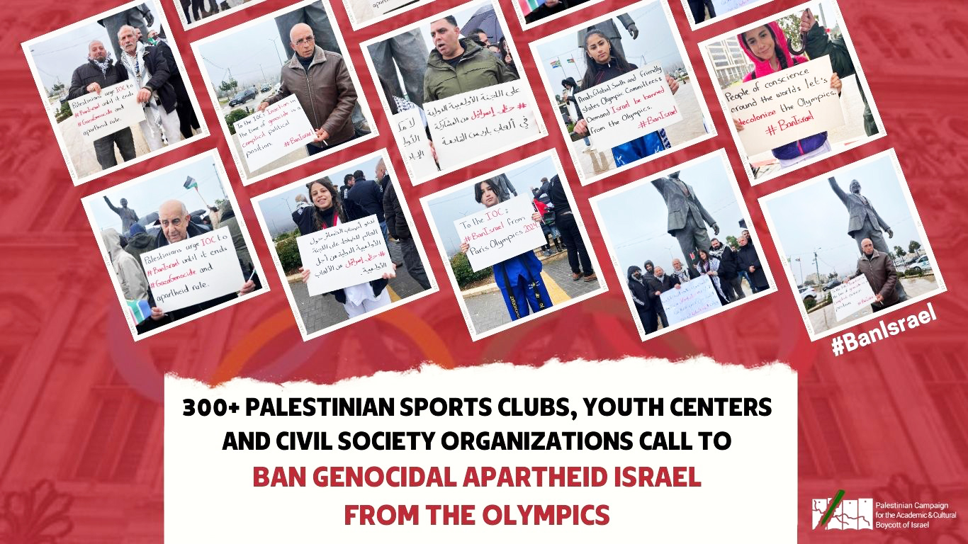 Nu går också runt 300 palestinska klubbar, fotbollsklubbar för både män och kvinnor, samt basket- och volleybollag ut och kräver att Israel idrottsbojkottas, detta i de döda palestinska idrottsmännens- och kvinnornas namn. I uppropet till IOC, #BanIsrael, heter det att IOC måste ”tillämpa sina principer och uppfylla sina skyldigheter genom att förbjuda Israel från att delta i nästa olympiska spel, i Paris i juli 2024. Detta tills Israel upphör med sina allvarliga brott mot internationell rätt, särskilt det israeliska apartheid-systemet och det pågående folkmordet i Gaza”.