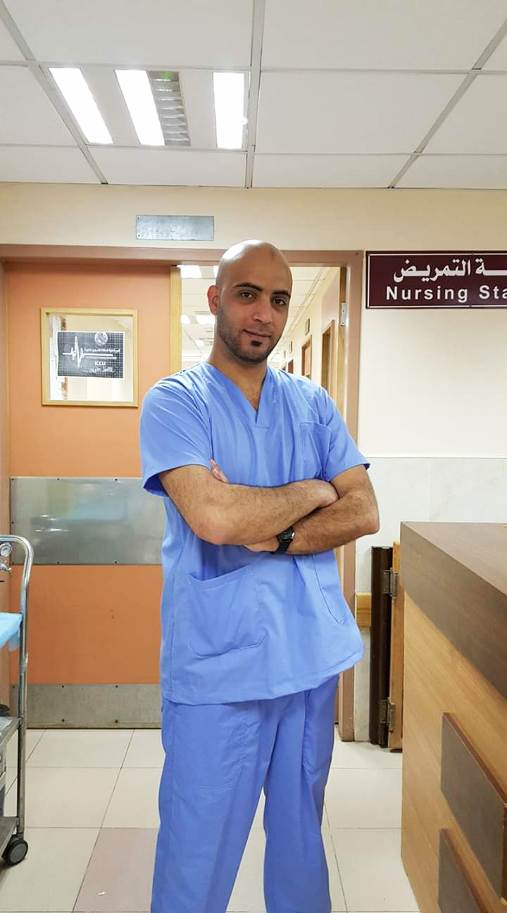 Ahmed Ismail när han jobbade på hematologimottagningen på Al-Shifa-sjukhuset. Han och hans hustru, en farmaceut, bor i Sverige sedan tre år tillbaka. Foto: Privat