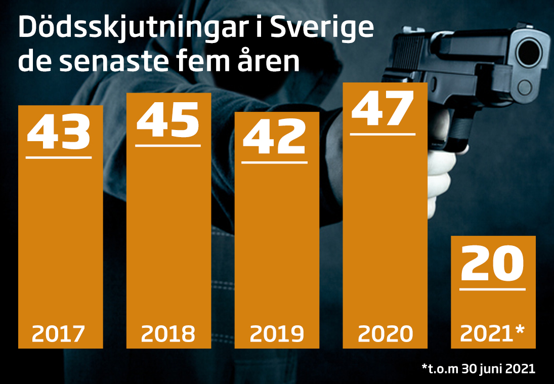 Sverige haft över fyrtio dödsskjutningar varje år de senaste fem åren. För tio år sedan, 2011, hade vi 17.  Foto: Proletären