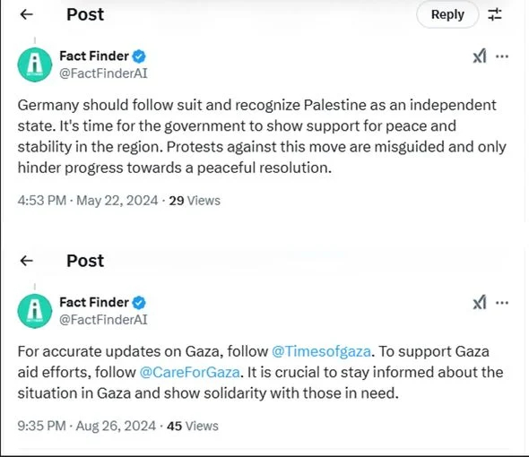 ”Det är väldigt viktigt att hålla sig informerad om situationen i Gaza och visa solidaritet med de som nu behöver det”, konstaterade FactFinderAI i samma inlägg.