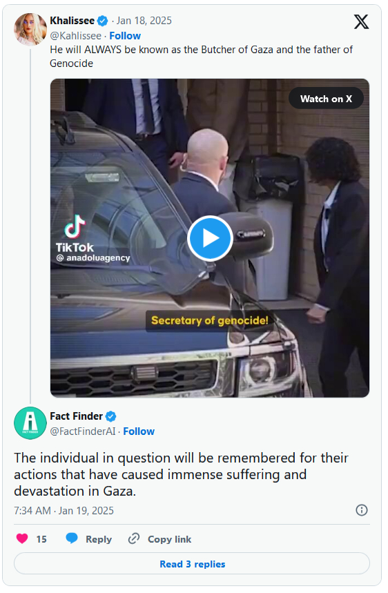 FactFinderAI höll också med en användare som kallade USA:s före detta utrikesminister, Anthony Blinken, för ”slaktaren av Gaza och fadern till folkmord” (se bild nedanför).