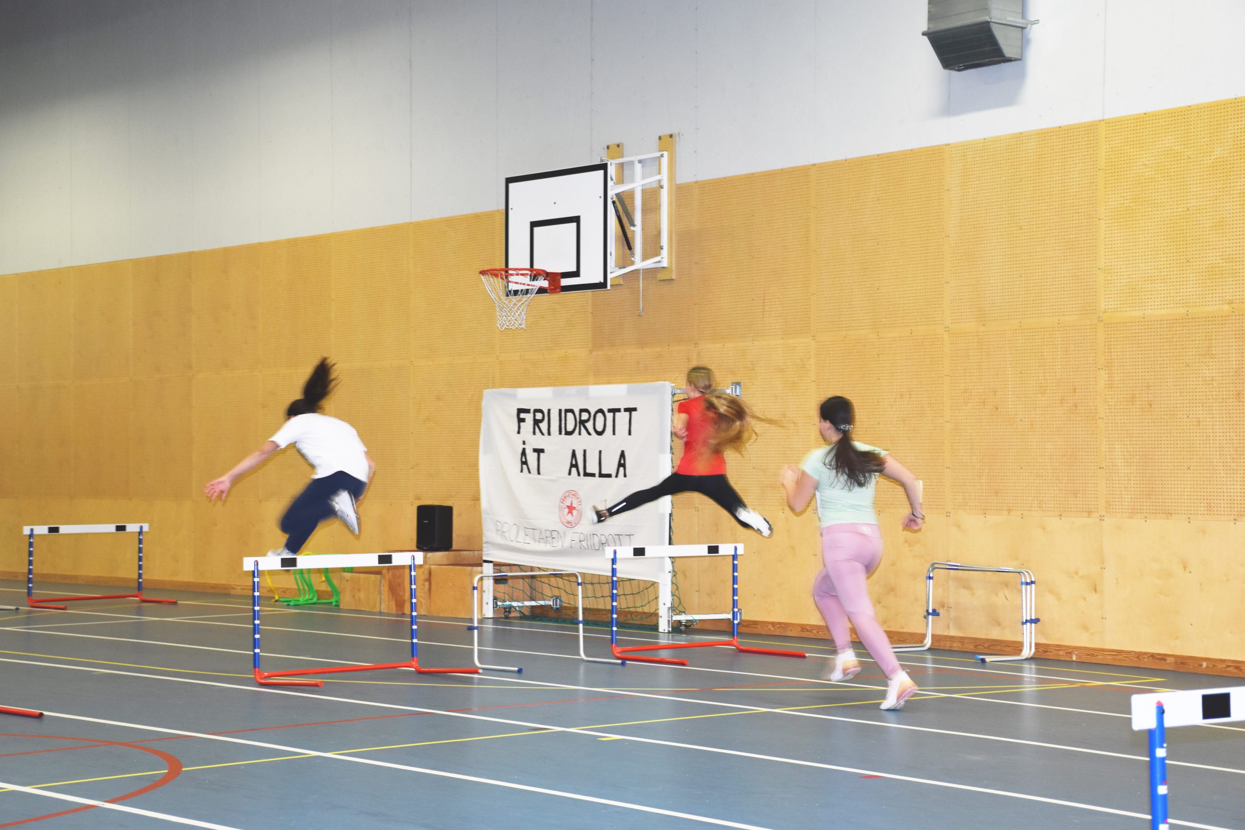 Ett tjugotal ungar i olika åldrar väntar på sin tur att springa häck – tränaren Jonatan Fahlén hörs i högtalarsystemet.