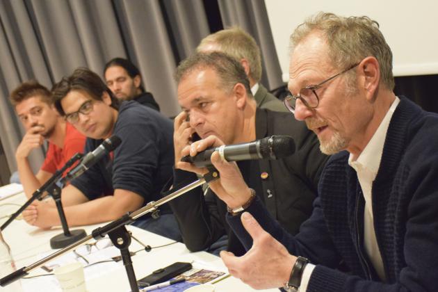 Järnvägsarbetarna Matthieu Bolle-Reddat och Axel Persson från den stridbara fackföreningen CGT i Frankrike berättade sedan om kampen mot EU-favoriten Emmanuel Macrons nedskärningspolitik. Den fredsplikt vi har i Sverige lät snudd på bisarr i deras öron – den franska arbetarklassen tar ofta till strejkvapnet och föreningen förbereder nu sina kamrater inom järnvägen för en stor strejk.