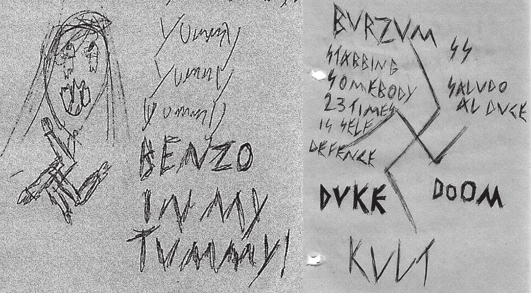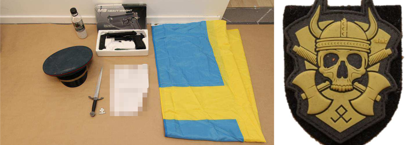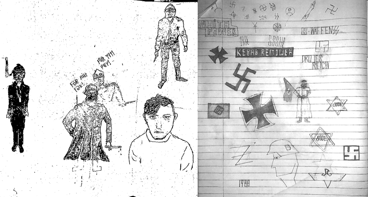 ”En röd anteckningsbok i A3 format där det stod skrivet om Hedi Fried [Förintelseöverlevare, reds. anm]. Samt en blå anteckningsbok i A4 storlek där han hade klottrat diverse tecken och ord. Bland annat hakkors, ‘white power’, ‘1488’ och järnkors m.m.”
