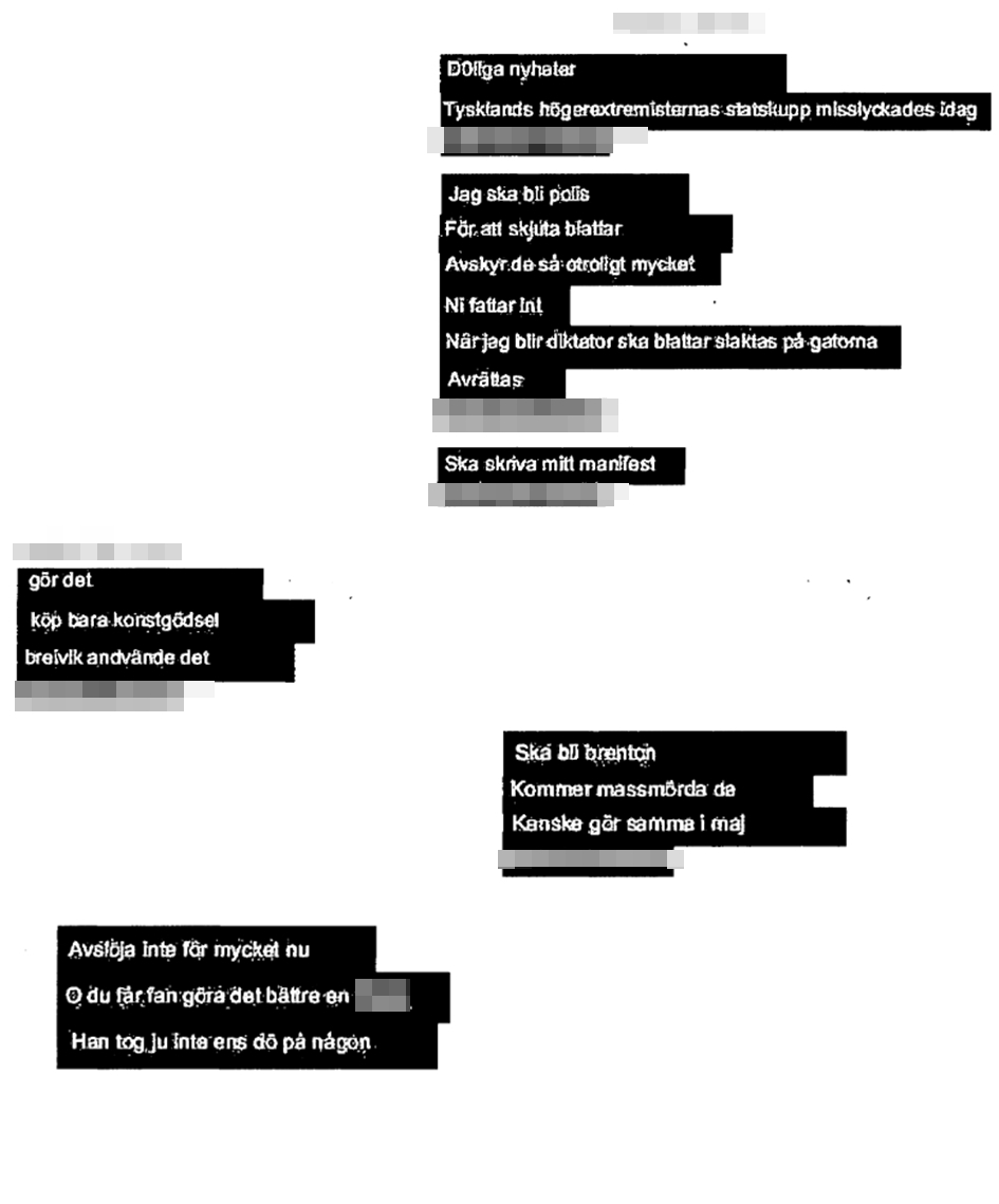 ”Jag ska sopa rent Sverige med allt jag har även om det betyder att jag måste få lite blod på mina händer… Sedan Europa började hjälpa flyktingar har det blivit dåligt. Inte bara för flyktingar, utan vita, svarta, judar, kristna, är körda allihop… Det är därför jag bestämt att göra någonting åt det… Särskilt tack till Solvent, min käraste och närmsta vän…”