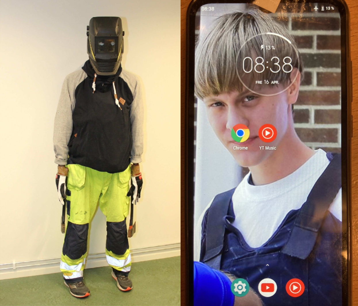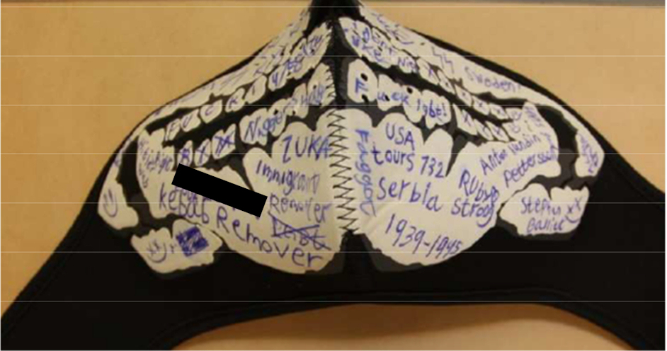 På sin ansiktsmask har 15-åringen skrivit politiska slagord, som syftar till högerextrema personer och handlingar. Bland annat ”Kebab remover”, ”immigrant remover” samt referenser till Slaget vid Tours, där Frankerna besegrade en muslimsk saracensk armé år 732 – och Anton Lundin Pettersson.