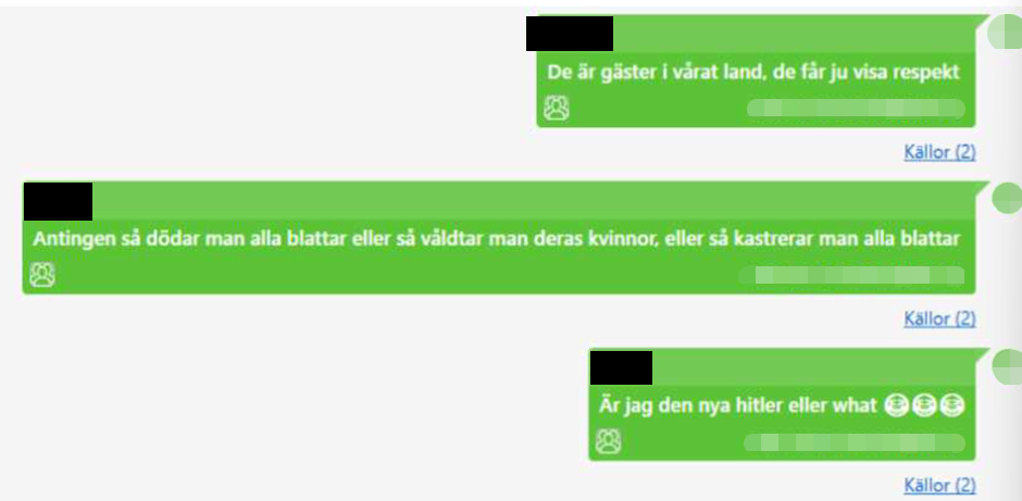”Hur ofta hör man om en vit man som begår en terrorattack eller liknande, inte så ofta skulle jag säga. Alltid negrer eller muslimer. Och det är sant… Gör som nazisterna. Sätt dem i läger och gasa de jävlarna…”