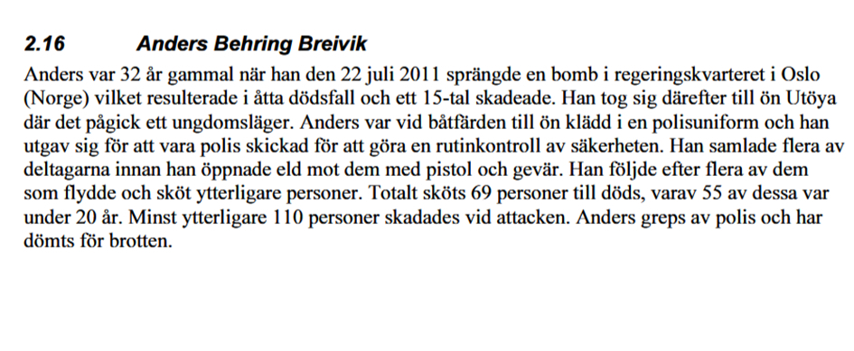 “Anders var 32 år gammal när han den 22 juli 2011 sprängde en bomb i regeringshögkvarteret i Oslo (Norge) vilket resulterade i åtta dödsfall och ett 15-tal skadeade [sic]. Han tog sig därefter till ön Utöya där det pågick ett ungdomsläger… Totalt sköts 69 personer till döds, varvar 55 av dessa var under 20 år.”
