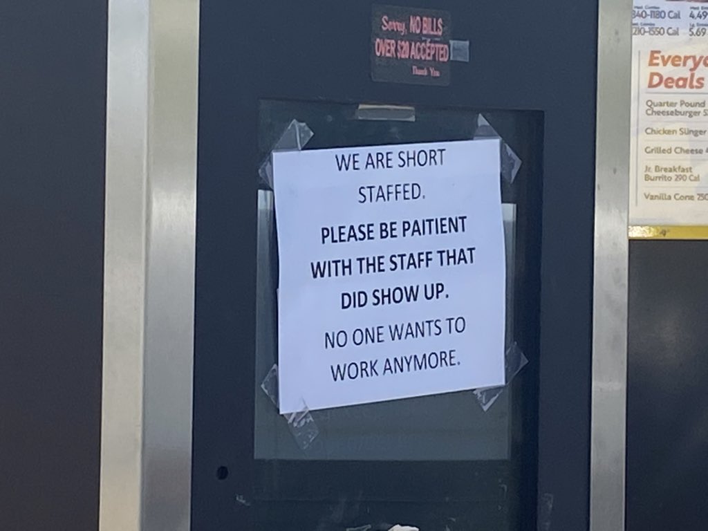 ”Vi är underbemannade. Vi ber om visad förståelse gentemot personalen som ändå dök upp. Ingen vill arbeta här längre.” Så står det på en skylt på drive-in-restaurangen Sonic i Albuquerque, New Mexico, USA.