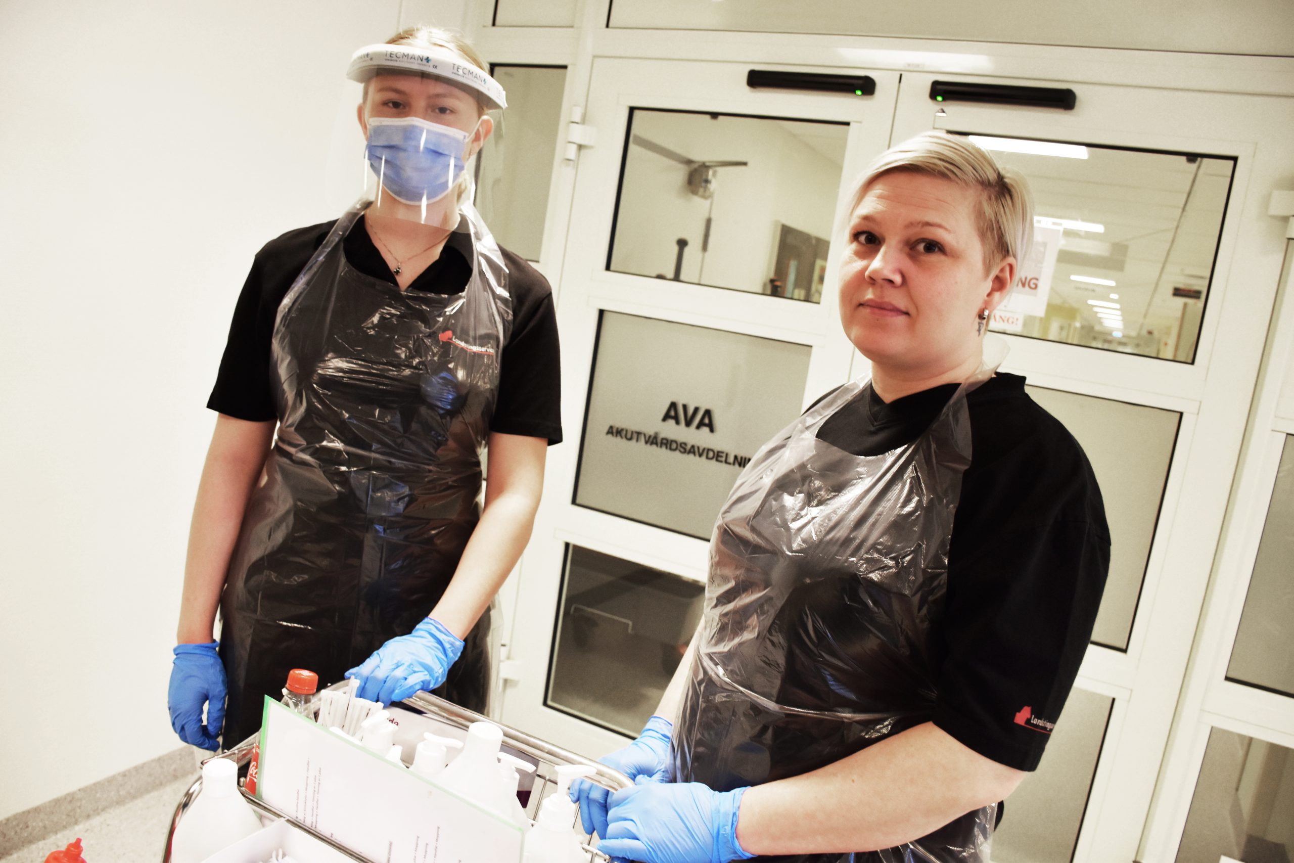 I städavdelningens korridor står Johanna Oscarsson och Stina Pharo och kontrollerar utrustningen de måste ha på sig under kvällspasset. Nästa steg är att fylla städvagnen som ska skeppas mellan lasarettets covidavdelningar.