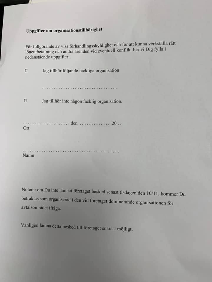 På H&M i Borås uppmanas personalstyrkan på cirka 800 anställda att fylla i ett formulär om huruvida de är medlemmar i facket eller inte, uppmärksammar Dagens Arena. Om personalen inte svarar på formuläret kommer personen att ”betraktas som organiserad i den vid företaget dominerande organisationen för avtalsområdet ifråga”.