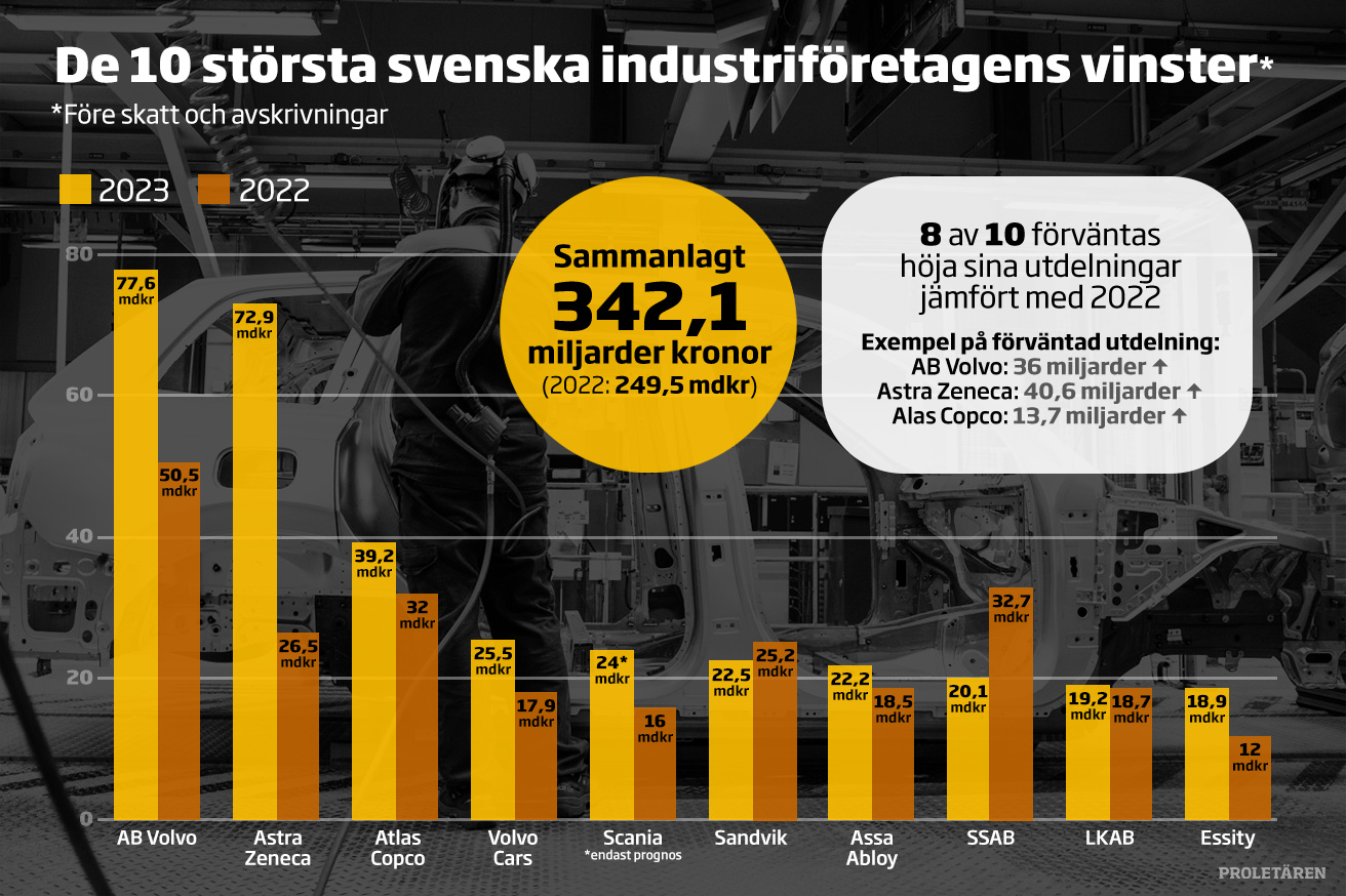 Proletärens genomgång av industriföretagens rapporter över helåret 2023 visar att de tio största industriföretagen gjort nästan 350 miljarder kronor i vinst, och planerar att dela ut minst 137 miljarder kronor till sina aktieägare.