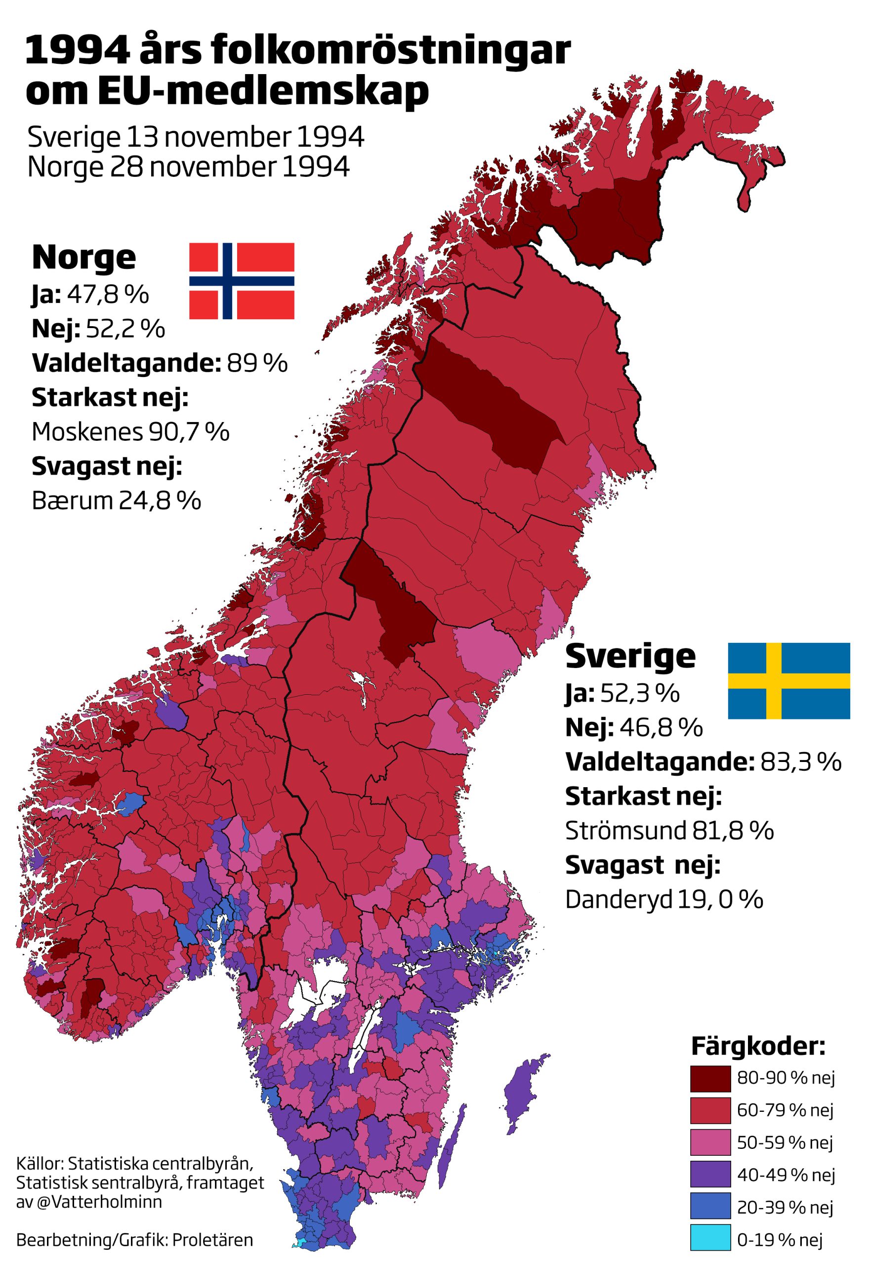 Resultatet i Sverige blev 52,3 procent för ja-sidan och 46,8 för nej. I Norge var siffrorna motsatta – 52,2 procent för nej-sidan, mot ja-sidans 47,8.